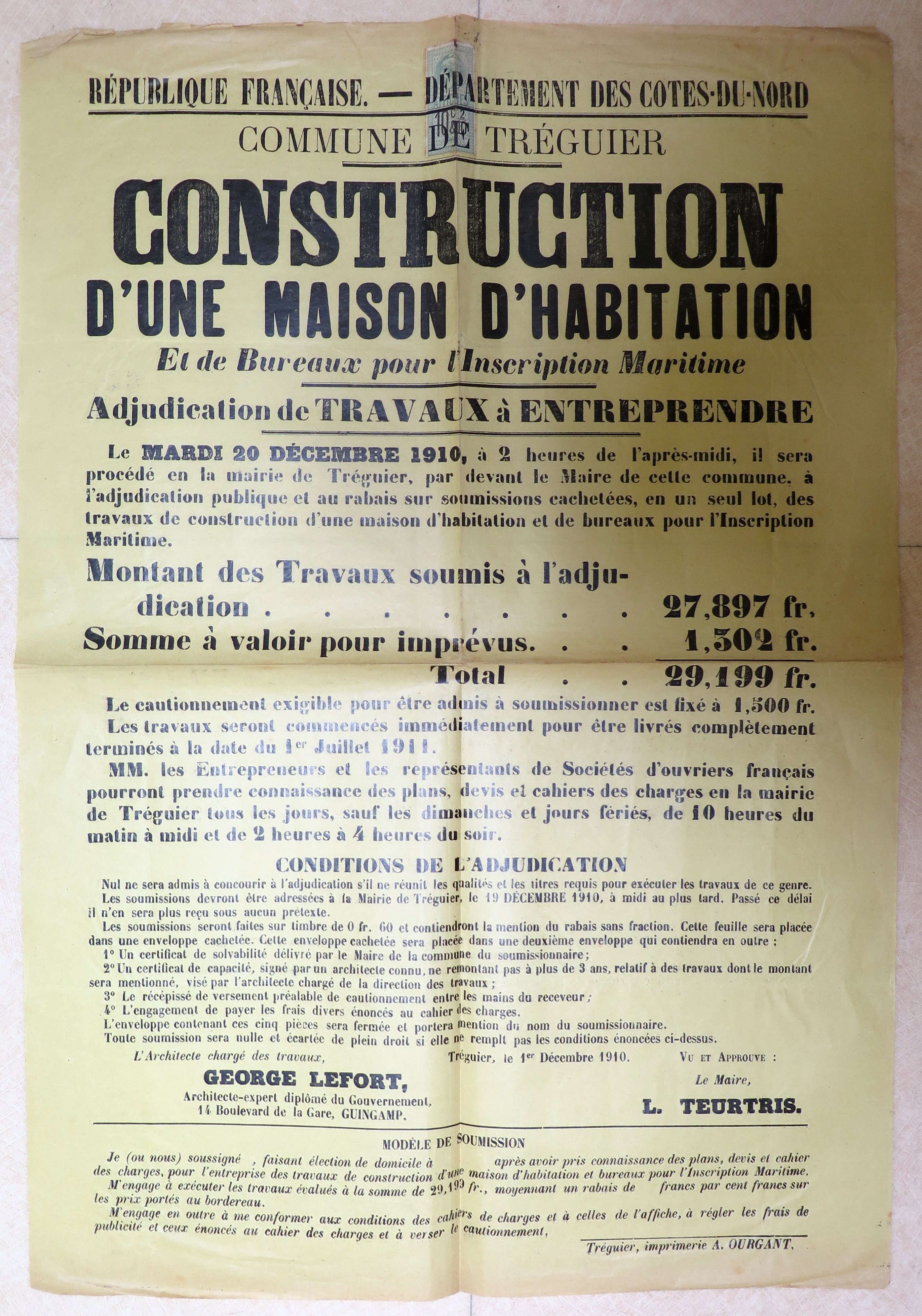 Tréguier, place de la République : affiche concernant l'adjudication d'une maison d'habitation et de bureaux pour l'Inscription maritime par l'architecte Georges Lefort de Guingamp et L. Teurtris maire de Tréguier, 1er décembre 1910 (Archives municipales de Tréguier, 5M4)Immatriculation