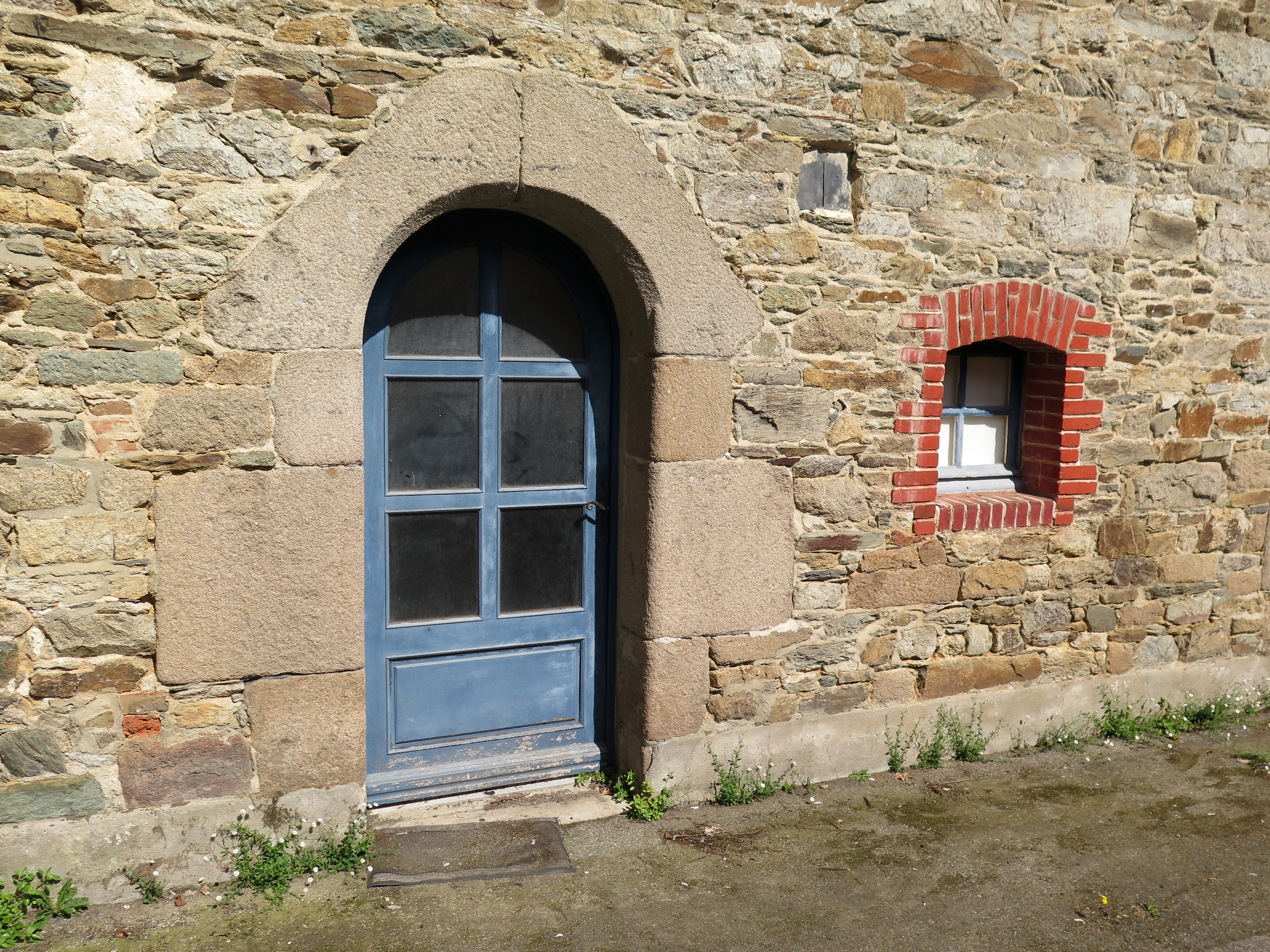 Tréguier, 9 rue des Perdreries (Perderies) : maison dite "Scolasticat", aile nord en retour d’équerre vers l’est, élévation sud sur cour, détail de la porte en arc plein cintre et de la petite baie à entourage en brique, état en 2017Immatriculation