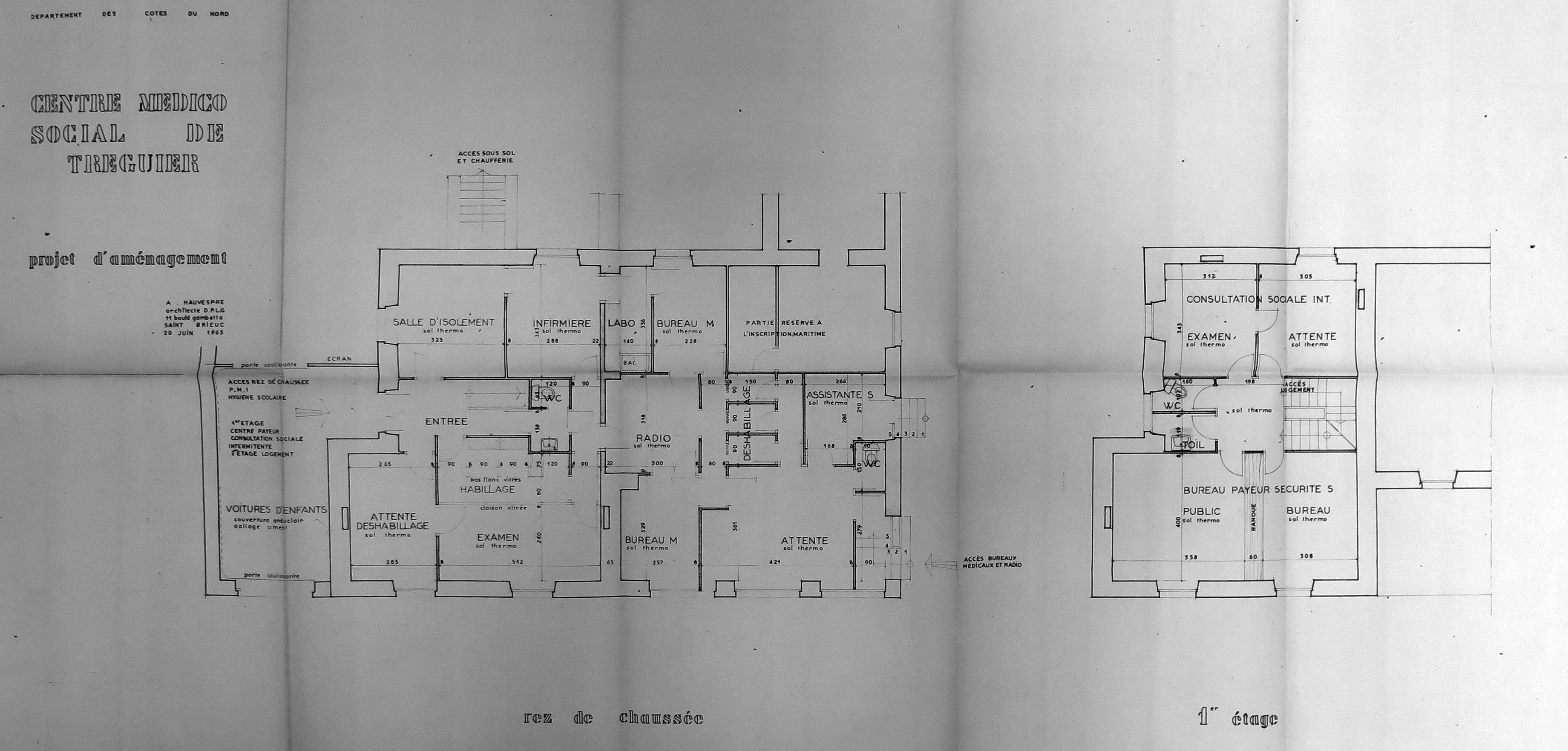 Tréguier, rue Pasteur : projet d'aménagement du centre médico-social dans le bâtiment de l'Inscription maritime par l'architecte André Hauvespre, 20 juin 1965 (Archives municipales de Tréguier, 6M4)Immatriculation