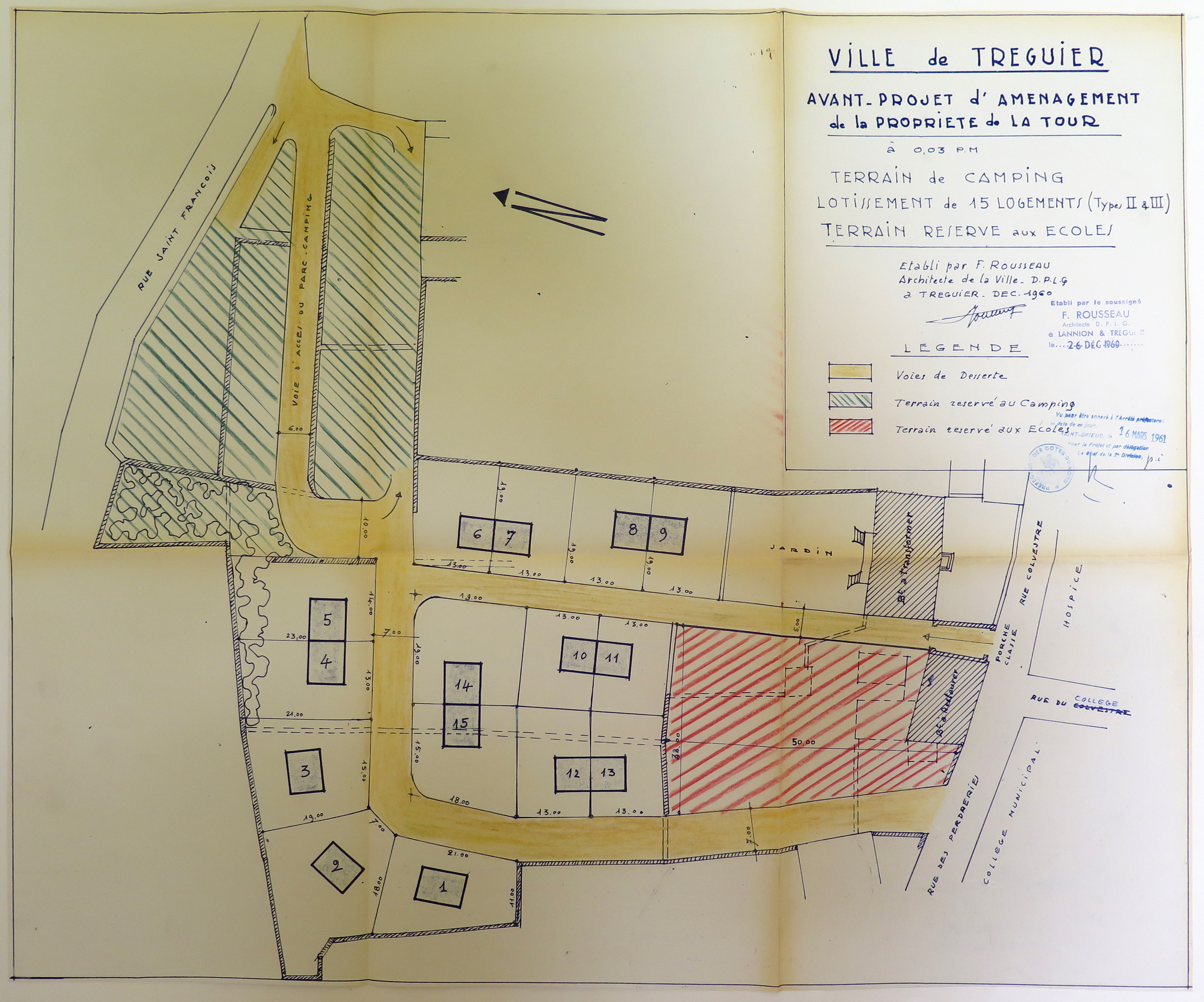 Avant-projet d'aménagement de la propriété de La Tour par l'architecte de la ville F. Rousseau (terrain de camping, lotissement de 15 logements type II et III, terrain réservé aux écoles), 26 décembre 1960 (Archives municipales de Tréguier, 6M5)Immatriculation