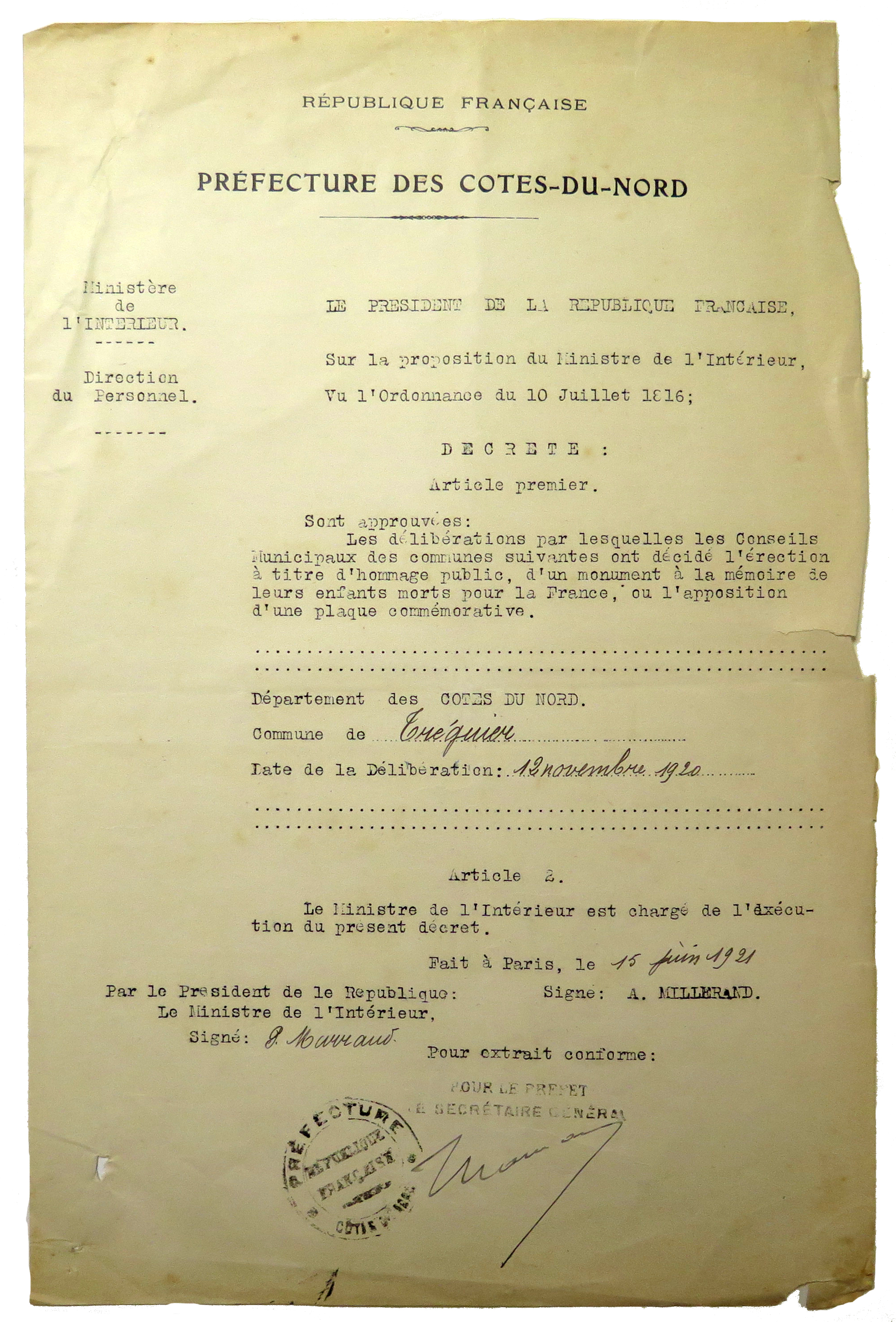 Décret du Ministère de l'Intérieur approuvant l'érection du monument aux morts de Tréguier (après délibération du conseil municipal de Tréguier du 12 novembre 1920), 15 juin 1921 (Archives municipales de Tréguier, 1M5)Immatriculation