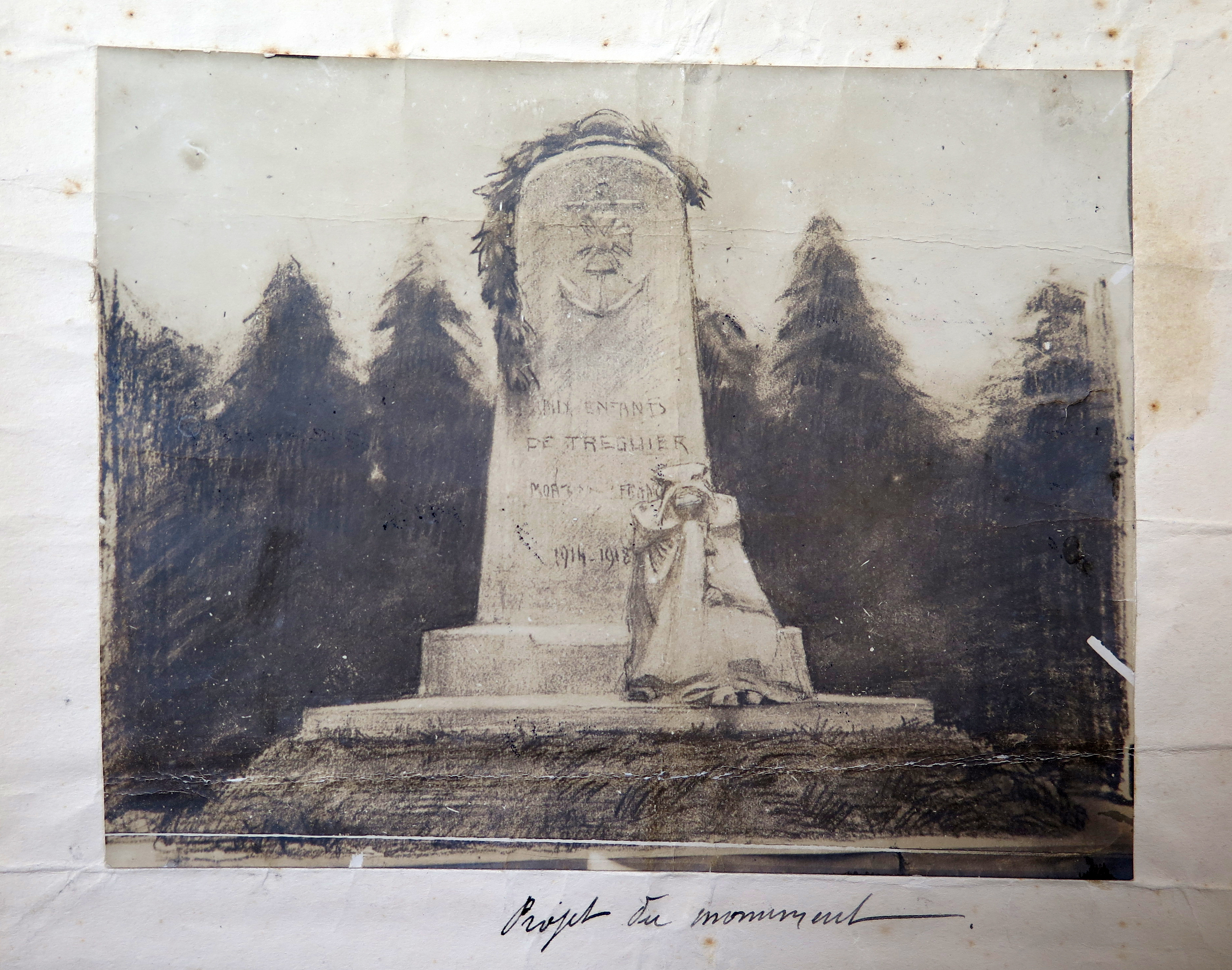 Dessin du projet de monument aux morts de Tréguier par le sculpteur Francis Renaud, devis non daté (novembre 1920 ?), validé par la préfecture des Côtes-du-Nord le 27 juin 1921 (Archives municipales de Tréguier, 1M5)Immatriculation