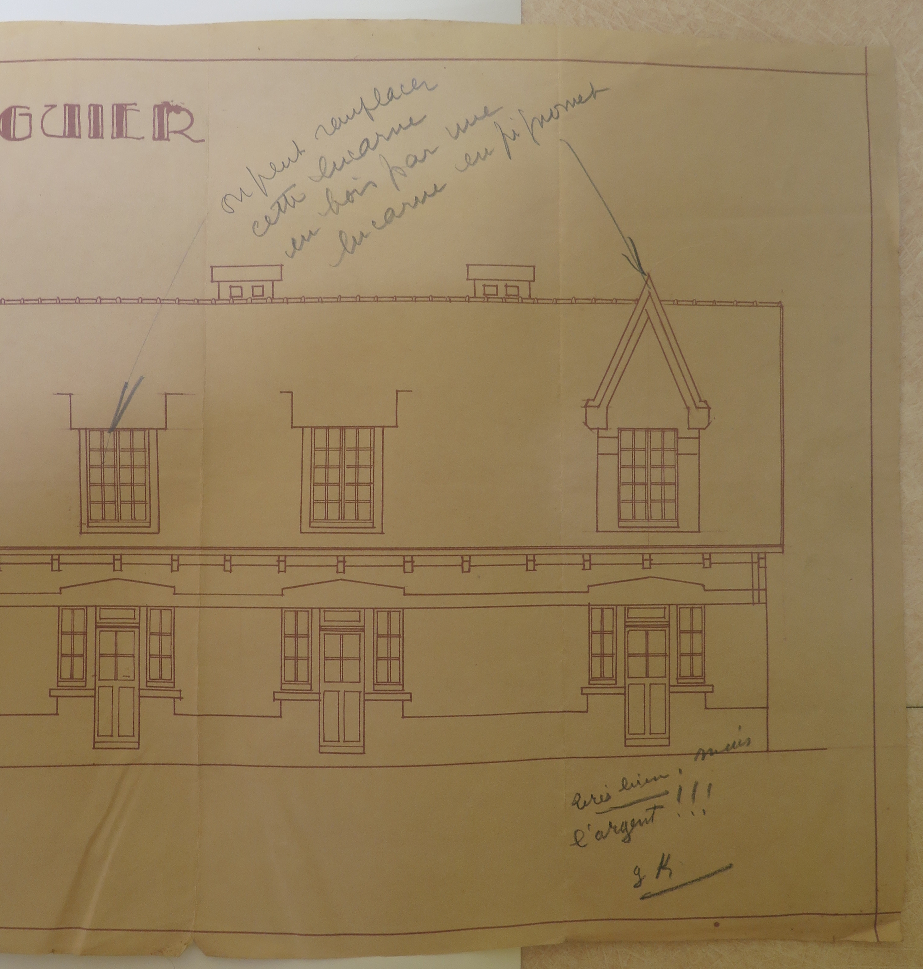 Tréguier : habitations à bon marché, groupe sur rue, détail de l'élévation/façade sud, projet de l'architecte Le Gouëllec de Saint-Brieuc, 25 juillet 1932 (Archives municipales de Tréguier, 1W5). Cette élévation a été annotée, on peut ainsi lire : "on peut remplacer cette lucarne en bois par une lucarne en pignonnet" (ce qui fut fait) et le commentaire de Gustave de Kerguezec : "très bien, mais l’argent !!!"Immatriculation