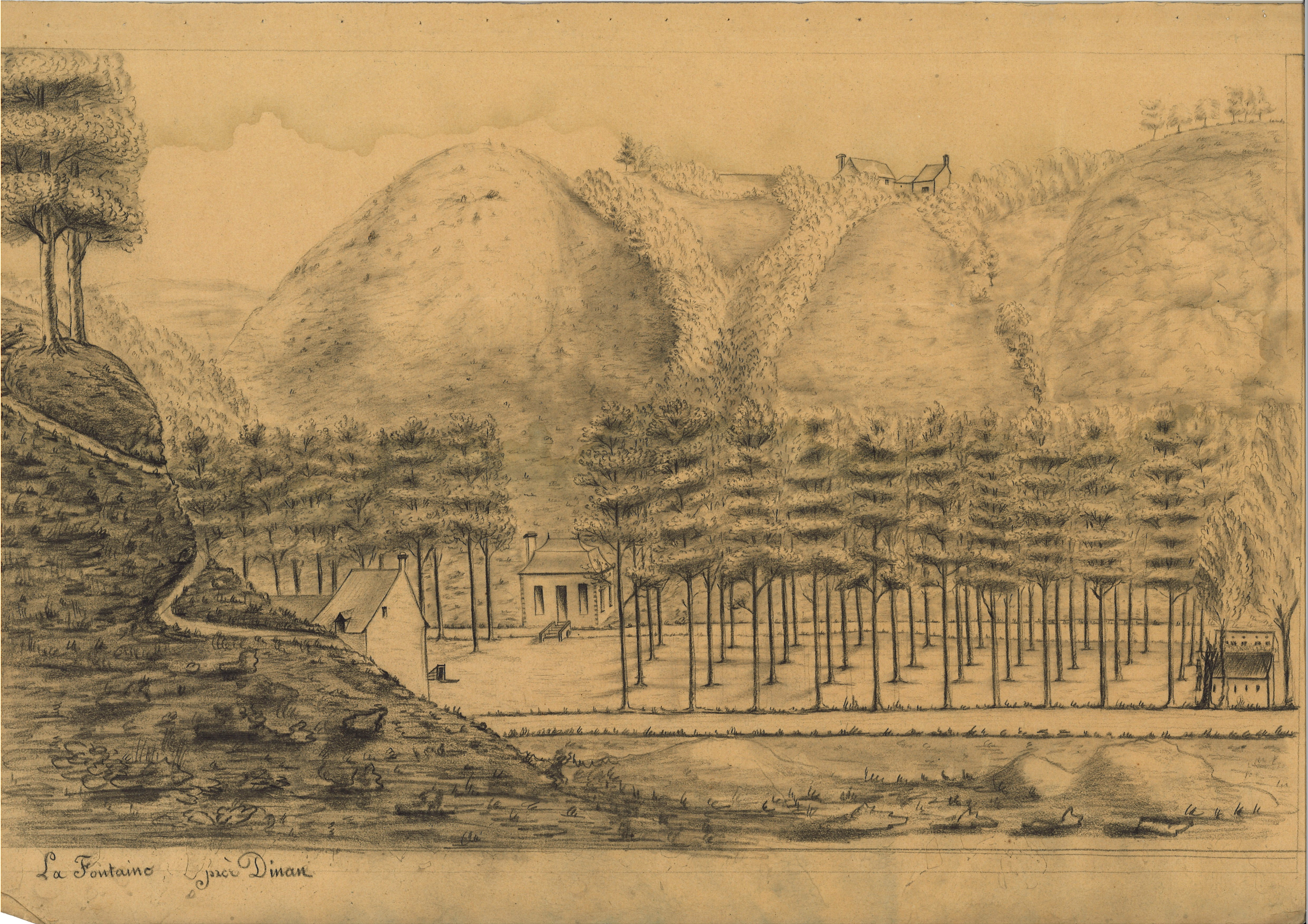 Promenade et pavillon, La Fontaine près de Dinan, dessin anonyme, vers 1810. Coll. Bibliothèque municipale de DinanImmatriculation