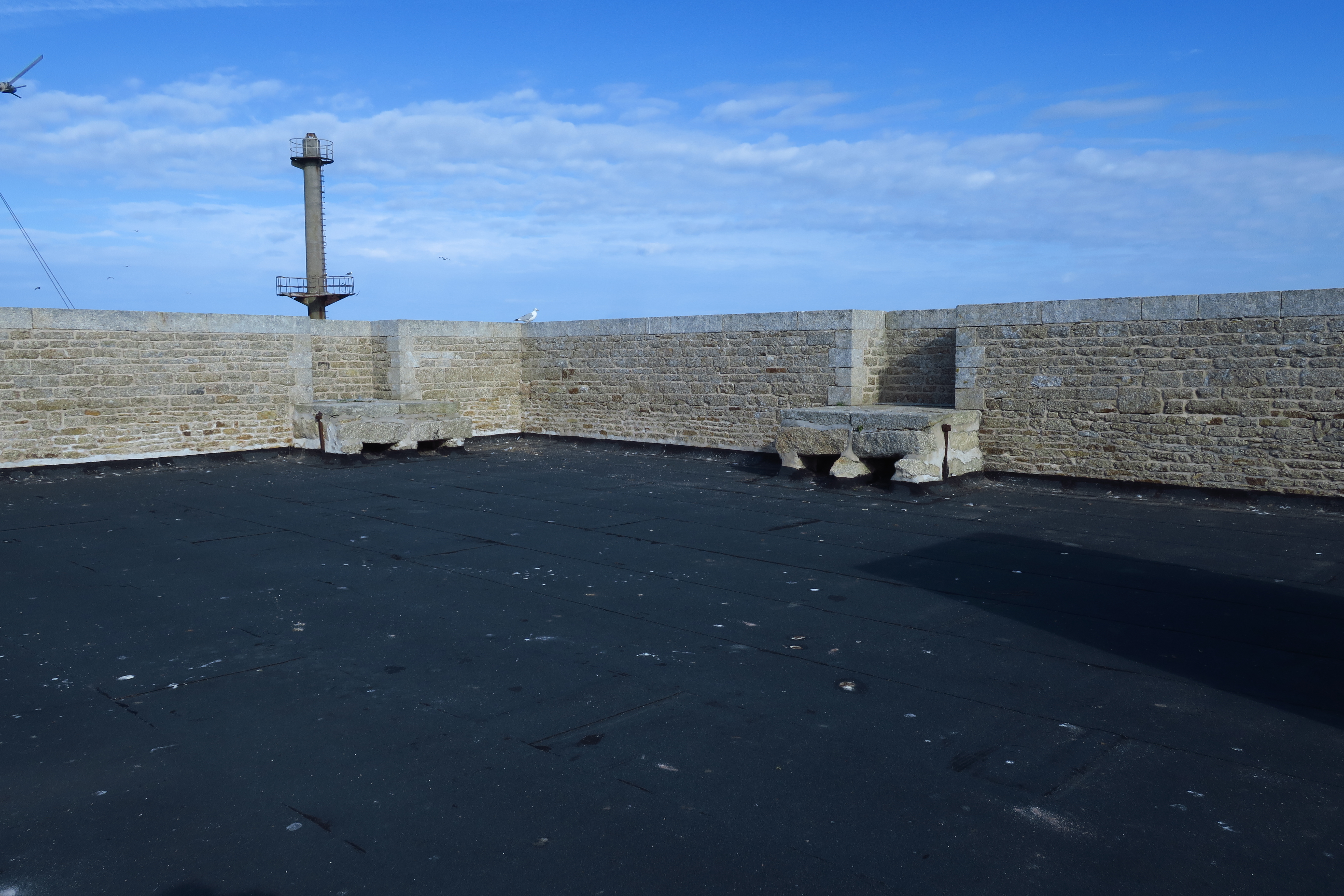 Archipel de Glénan, batterie de Penfret, corps de garde crénelé, la terrasse sans ses banquettes en terre en 2017.Immatriculation