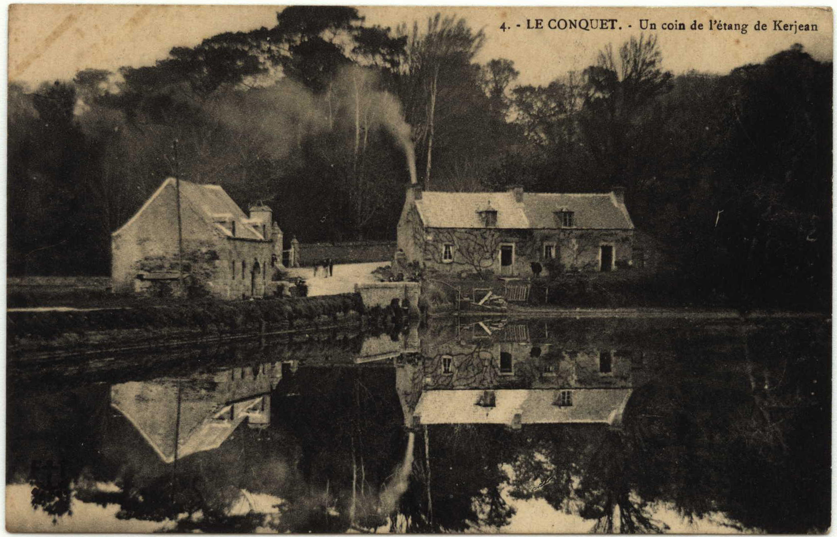 Carte postale,"Le Conquet - Un coin de l'Etang de Kerjean", vue du moulin et de la maison du meunier depuis les rives de l'étangImmatriculation