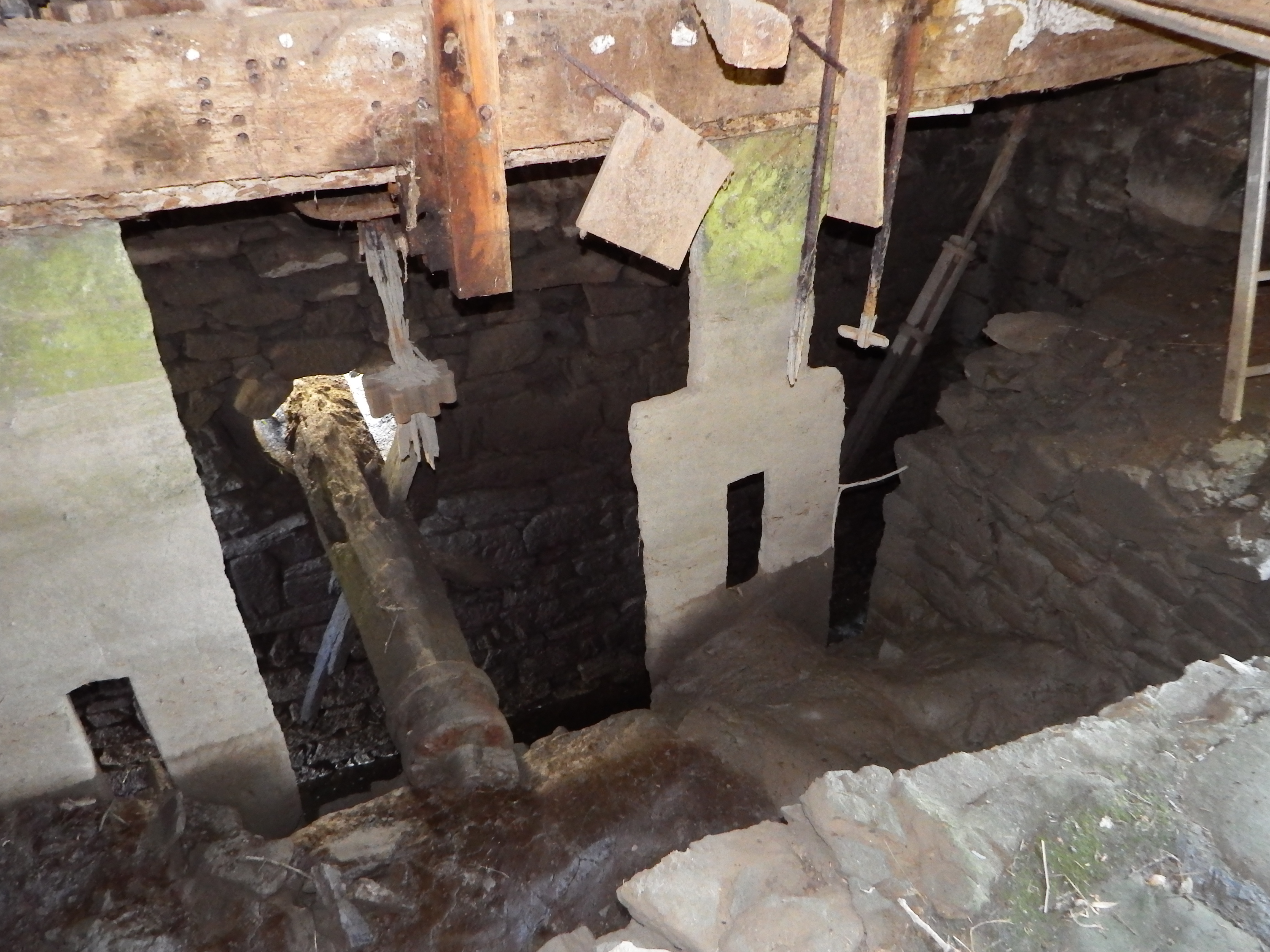 Vue sur les deux arbres des anciennes roues : au premier plan à gauche l'arbre de la roue verticale et au fond de la fosse, posé sur le mur, l'abre de la pirouetteImmatriculation