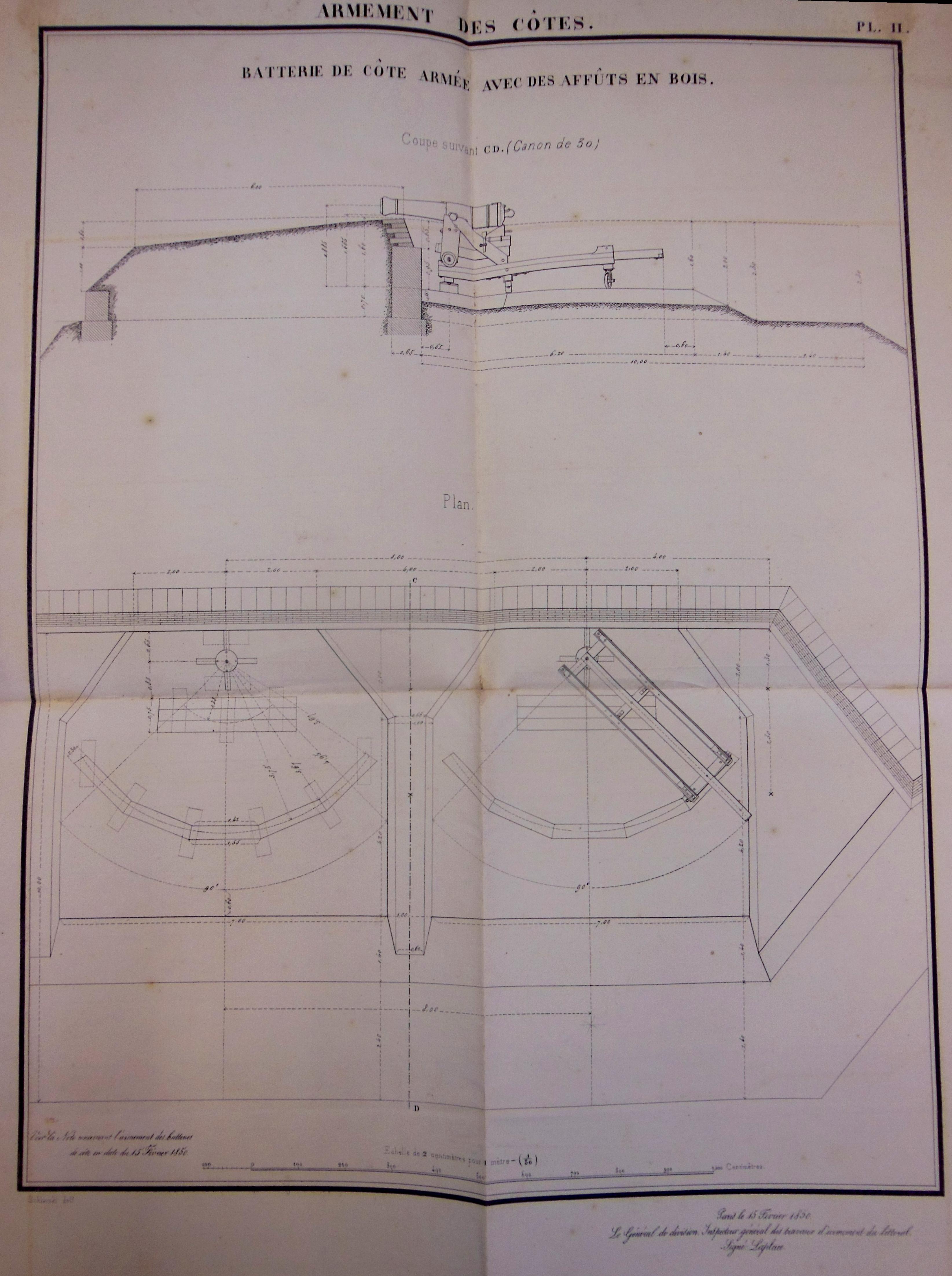 Service historique de la Défense, Département Marine, Lorient. Archives de la Place et du Génie de Belle-Île-en-Mer ; Sous-série 4 S2, archives du Génie de Belle-Île-en-Mer : 4 S2 8, Ministère de la Guerre, Inspection générale de la défense des côtes, Instruction sur les batteries de côte, 15 février 1850.