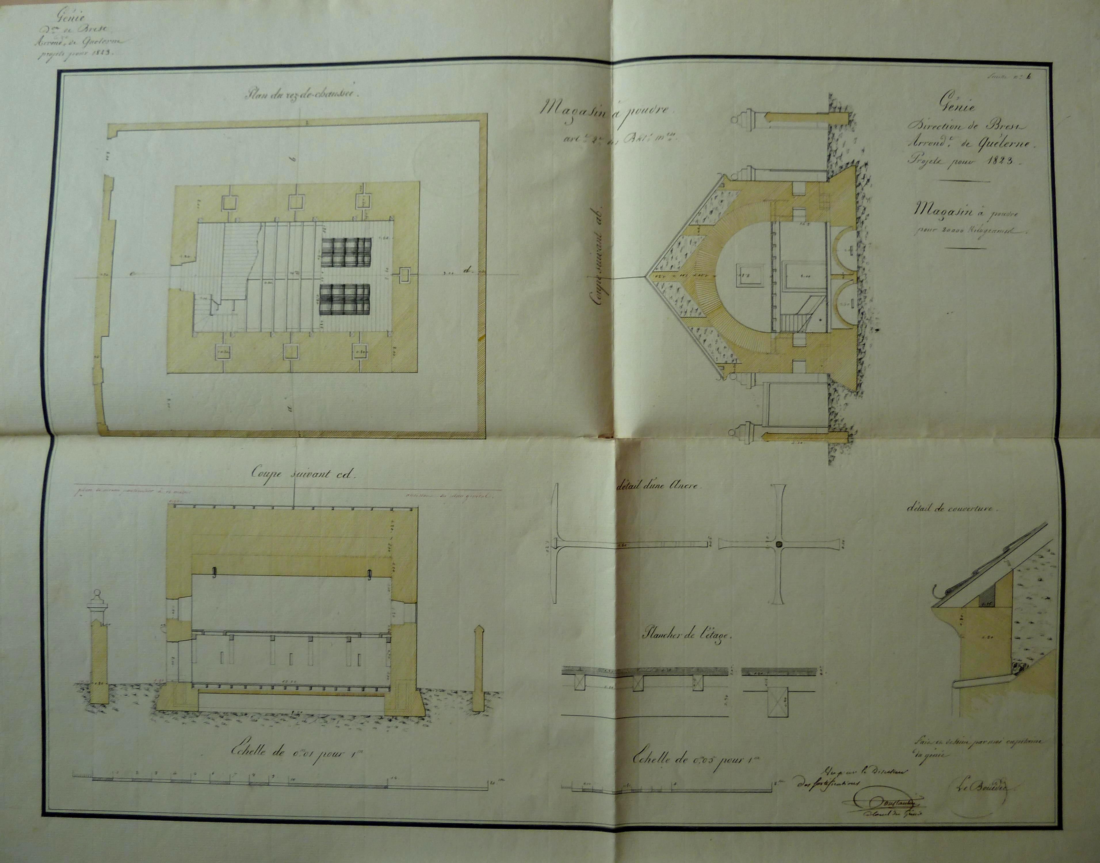 Service historique de la Défense, département Armée de Terre, Vincennes. Archives du Génie ; Article 8, Places françaises et d'Algérie : 1 VH 1494, Place de Quélern, projets et dépenses annuels, 1821-1826. Direction du Génie de Brest, Place de Quélern, feuille n° 6 des projets pour 1823, magasin à poudre de 20000 kilogrammes.