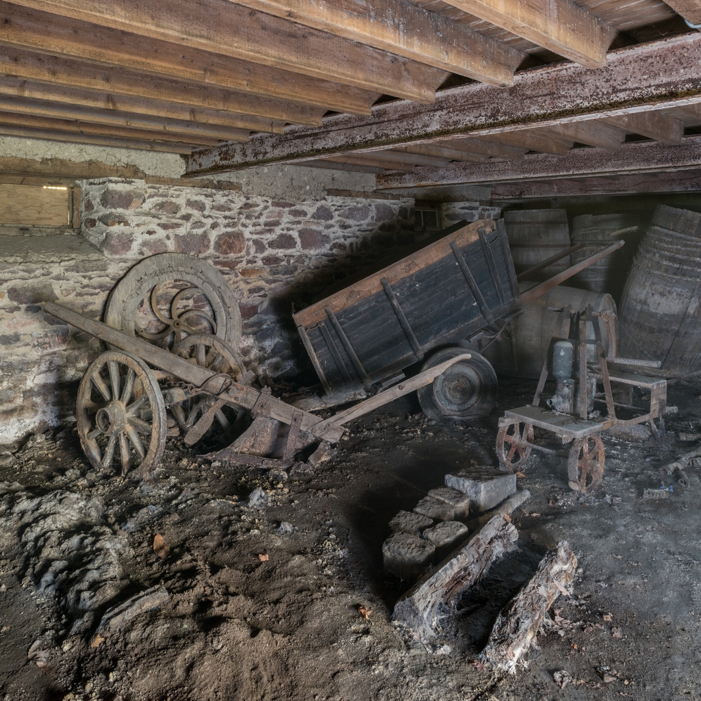 Intérieur de l'ancienne cidrerie, avec outils anciens (charrette à bras, charrue, tonneaux)Immatriculation