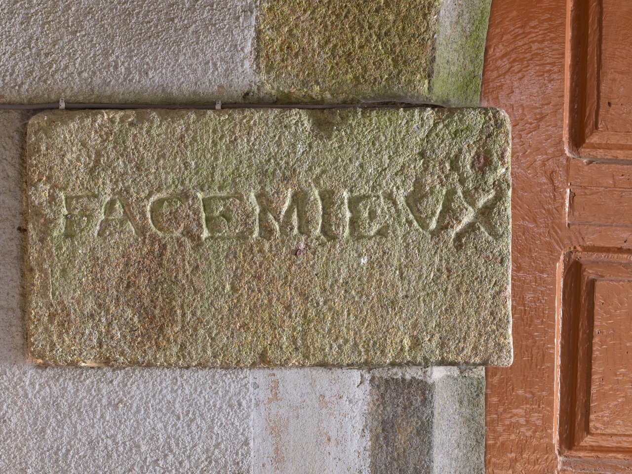 Porche Ouest : détail de l'inscription "Face mieux qui pourra"Immatriculation