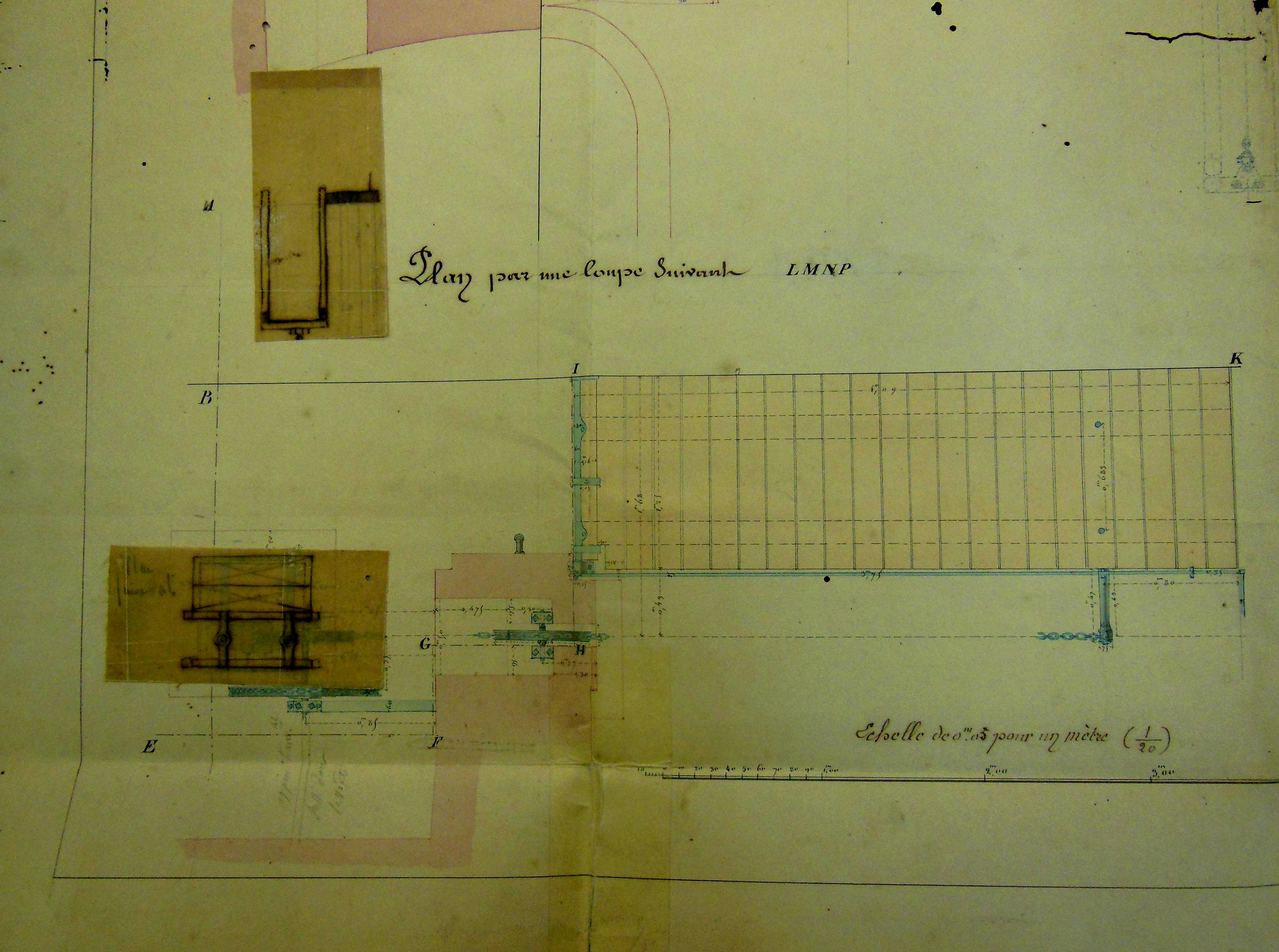 Service historique de la Défense, Département Marine, Lorient. Archives de la Place et du Génie de Belle-Île-en-Mer ; Sous-série 4 S3, archives de la Place de Houat-Hoedic : 4 S3 5, Projets, Houat. Direction du Génie de Brest, Place de Houat-Hoedic, croquis relatif à l'établissement d'un pont-levis dans les forts de Houat et d'Hoedic, 14 avril 1855.