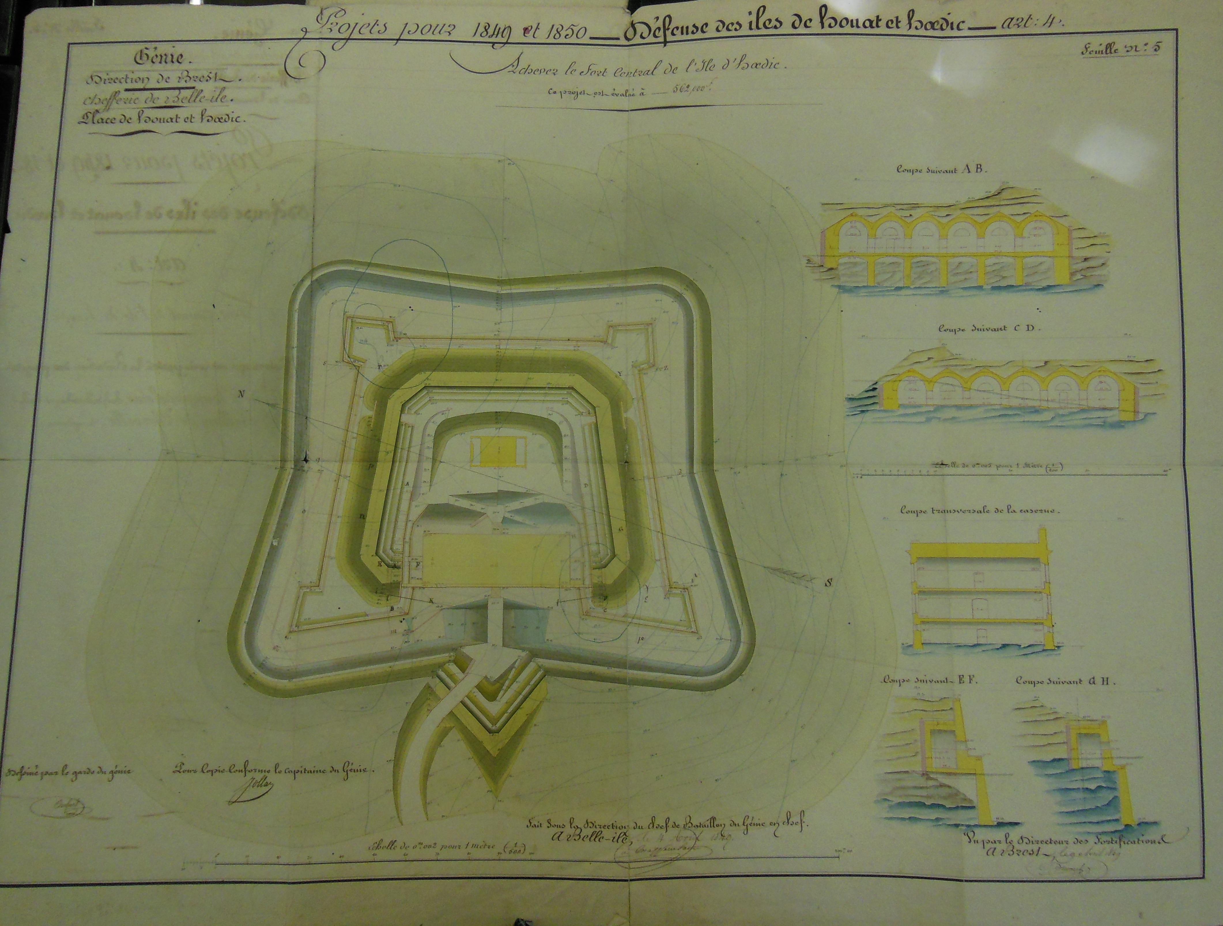 Service historique de la Défense, Département Marine, Lorient. Archives de la Place et du Génie de Belle-Île-en-Mer ; Sous-série 4 S3, archives de la Place de Houat-Hoedic : 4 S3 5, projets, Houat. Direction du Génie de Brest, Place de Houat-Hoedic, feuille n° 5 des projets pour 1849-1850, achever le fort central de l'Ile d'Hoedic, 4 avril 1849.