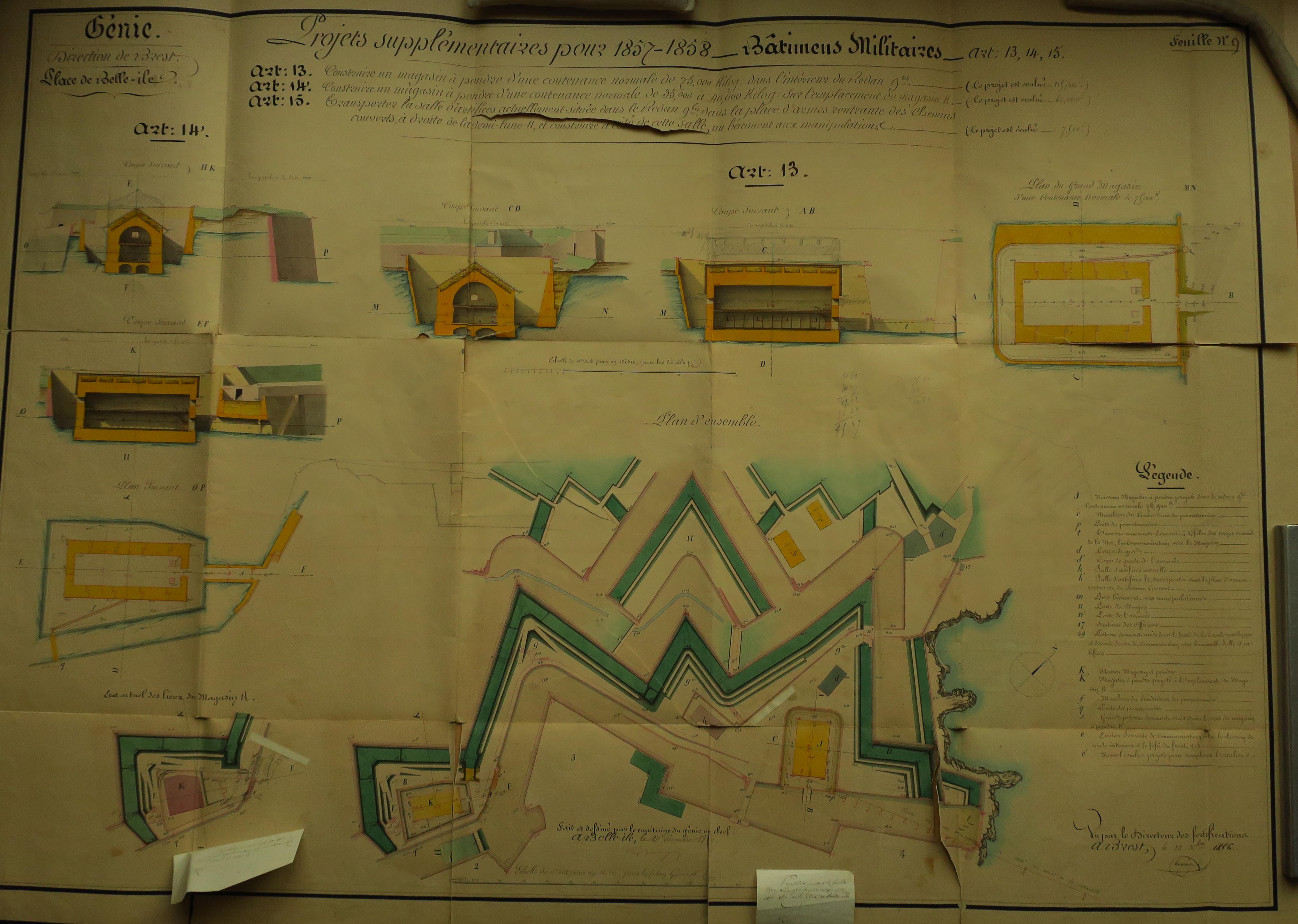 Service historique de la Défense, département Armée de Terre, Vincennes. Archives du Génie ; Article 8, Places françaises et d'Algérie : 1 VH 294, Place de Belle-Île-en-Mer, projets et dépenses annuels, 1854-1857. Direction du Génie de Brest, Place de Belle-Ile, feuille n° 9 des projets supplémentaires pour 1856-1857, magasins à poudre, 20 décembre 1856.