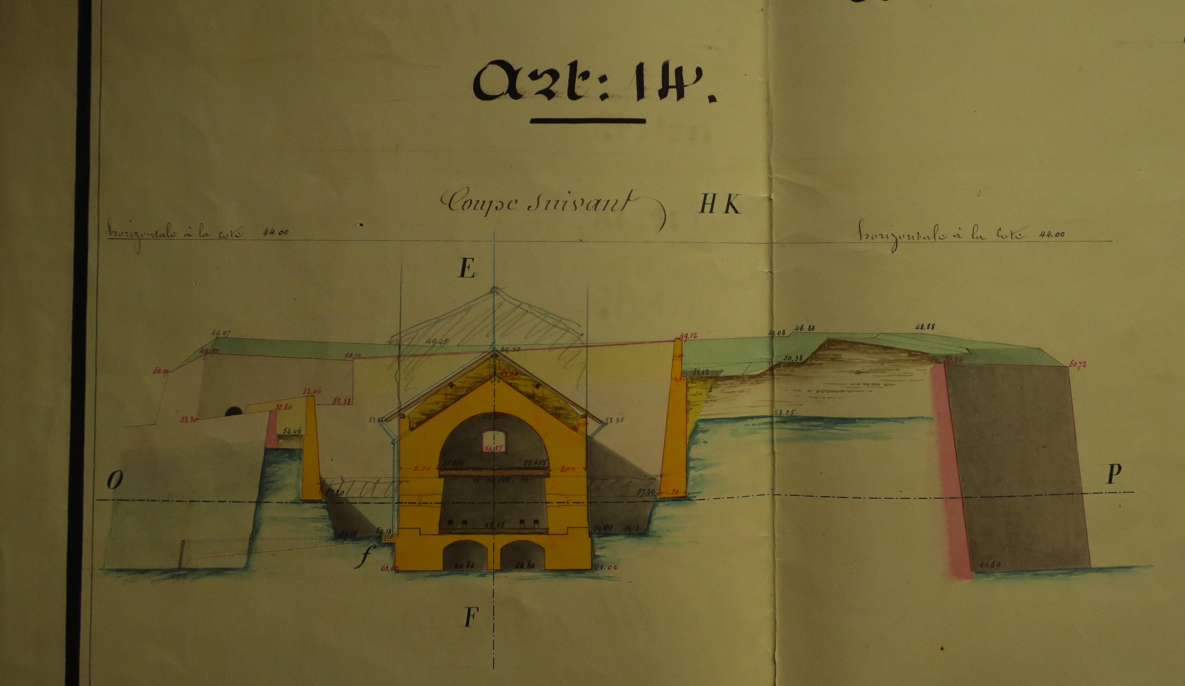 Service historique de la Défense, département Armée de Terre, Vincennes. Archives du Génie ; Article 8, Places françaises et d'Algérie : 1 VH 294, Place de Belle-Île-en-Mer, projets et dépenses annuels, 1854-1857. Direction du Génie de Brest, Place de Belle-Ile, feuille n° 9 des projets supplémentaires pour 1856-1857, magasins à poudre, 20 décembre 1856.
