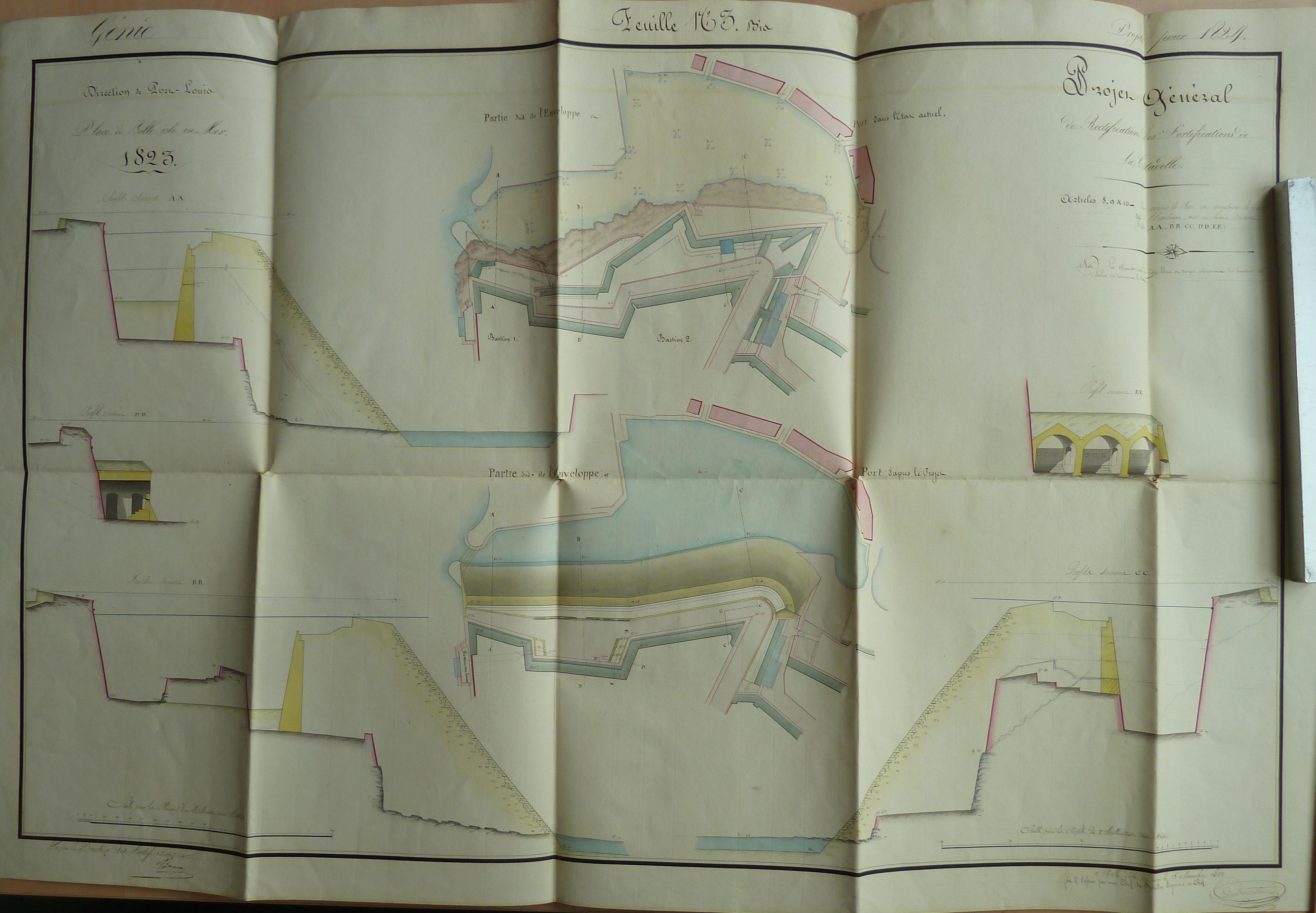 Service historique de la Défense, département Armée de Terre, Vincennes. Archives du Génie ; Article 8, Places françaises et d'Algérie : 1 VH 287, Place de Belle-Île-en-Mer, projets et dépenses annuels, 1815-1825. Direction du Génie de Port-Louis, Place de Belle-isle-en-Mer, feuille n° 3bis des projets pour 1824, projet général de rectification des fortifications de la citadelle, 15 novembre 1823.