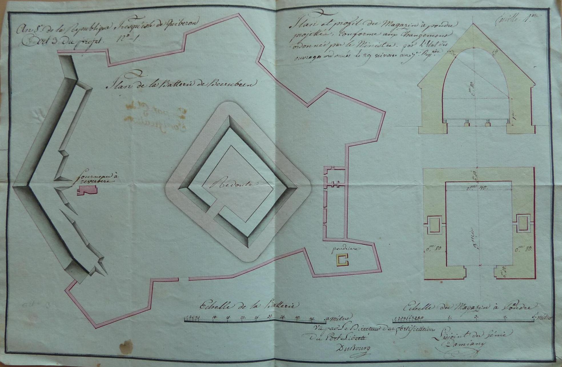 Service historique de la Défense, département Armée de Terre, Vincennes. Archives du Génie ; Article 8, Places françaises et d'Algérie : 1 VH 1515, Place de Quiberon, projets et dépenses annuels, 1847-1822. Presqu'île de Quiberon, feuille n° 1 des projets pour l'an 8e de la République, plan de la batterie de Becriberen, 29 nivôse an 7e [19 janvier 1799].