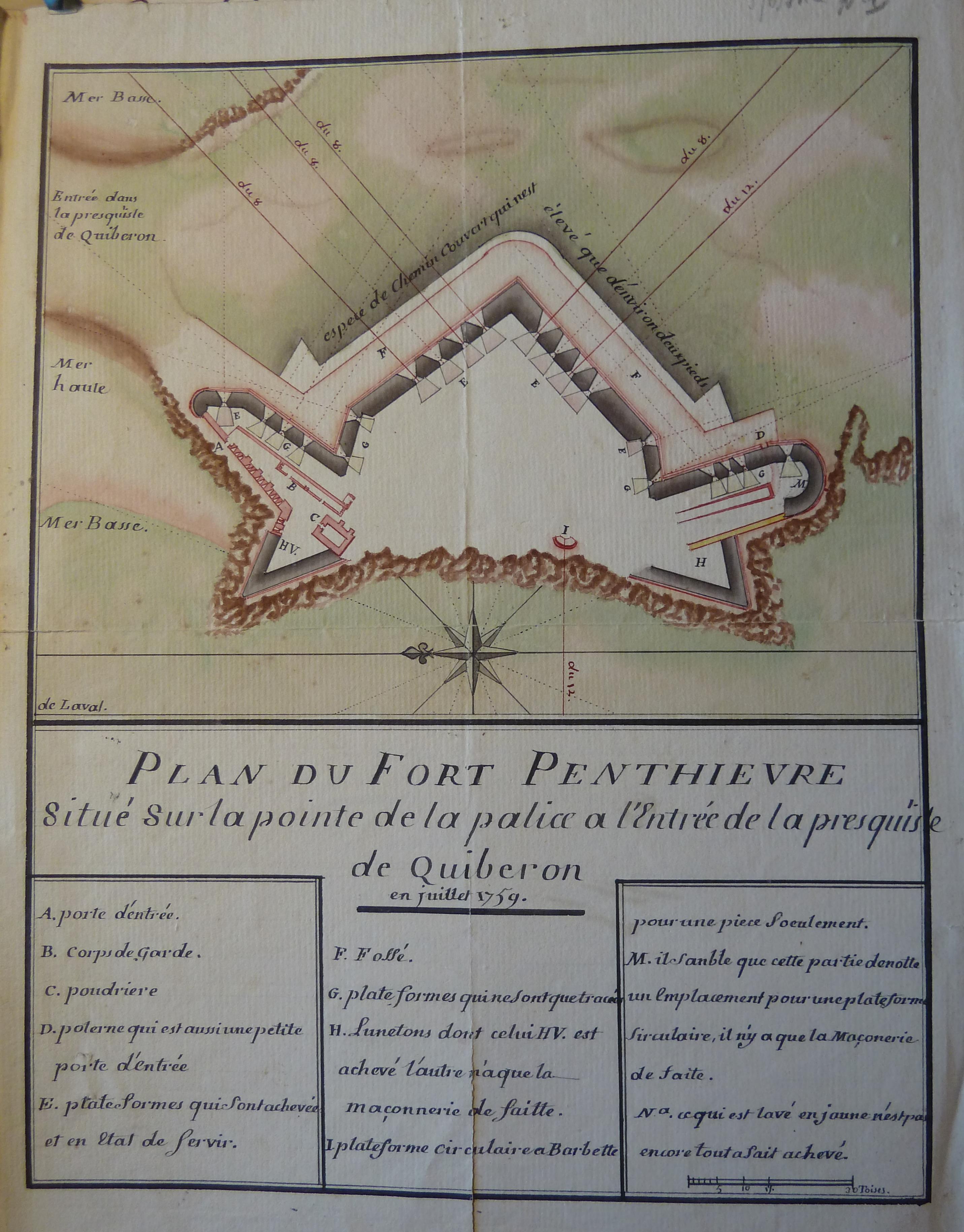 Service historique de la Défense, département Armée de Terre, Vincennes. Archives du Génie ; Article 8, Places françaises et d'Algérie : 1 VH 1515, Place de Quiberon, projets et dépenses annuels, 1747-1822. Plan du fort Penthièvre situé sur la pointe de la palice à l'entrée de la presquisle de Quiberon, juillet 1759.