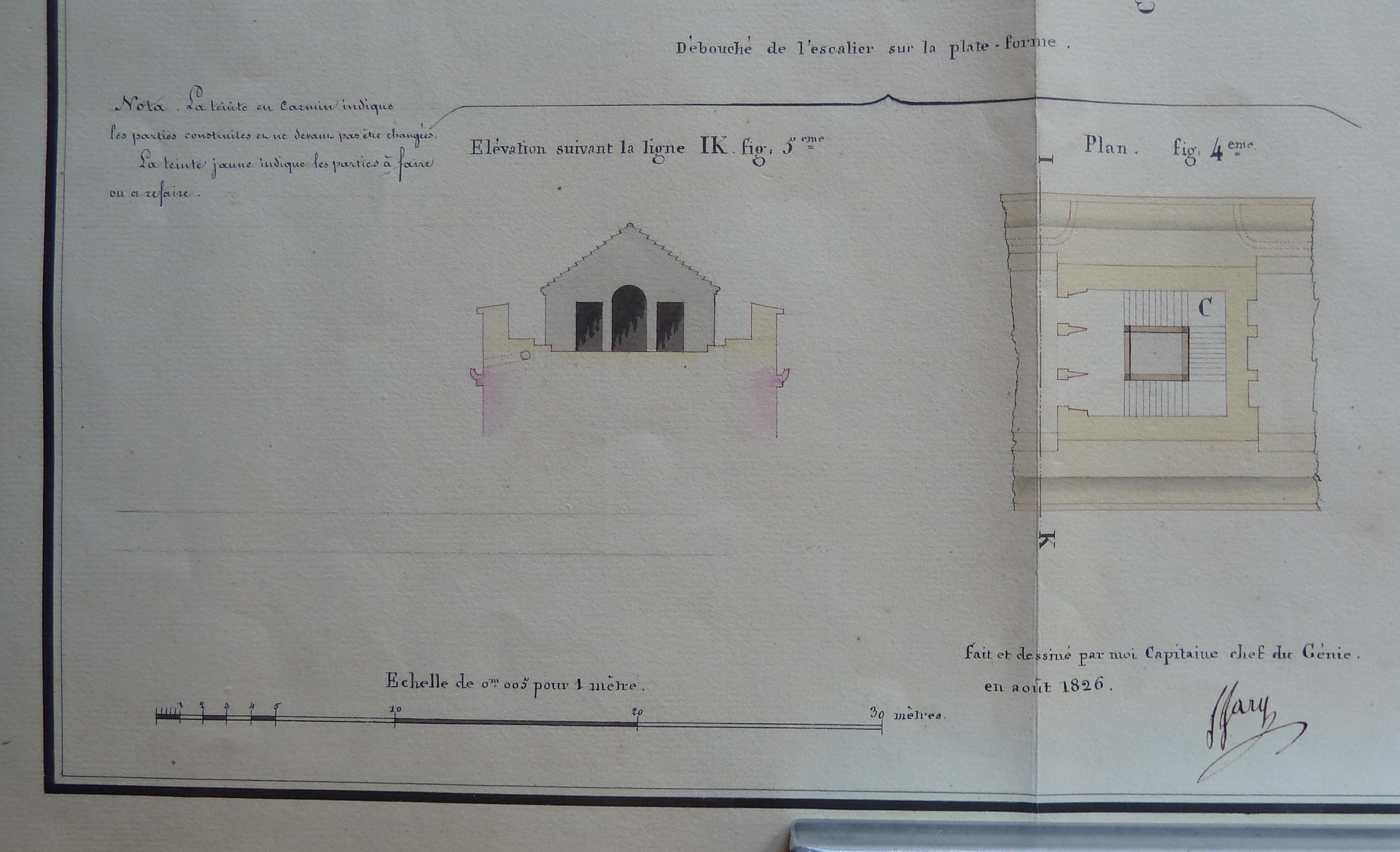 Service historique de la Défense, département Armée de Terre, Vincennes. Archives du Génie ; Article 8, Places françaises et d'Algérie : 1 VH 1516, Place de Quiberon, projets et dépenses annuels, 1823-1837. Direction du Génie de Port-Louis, Poste de Quiberon, feuille n° 1 des projets pour 1827, plan de la caserne défensive du fort Penthièvre, août 1826.