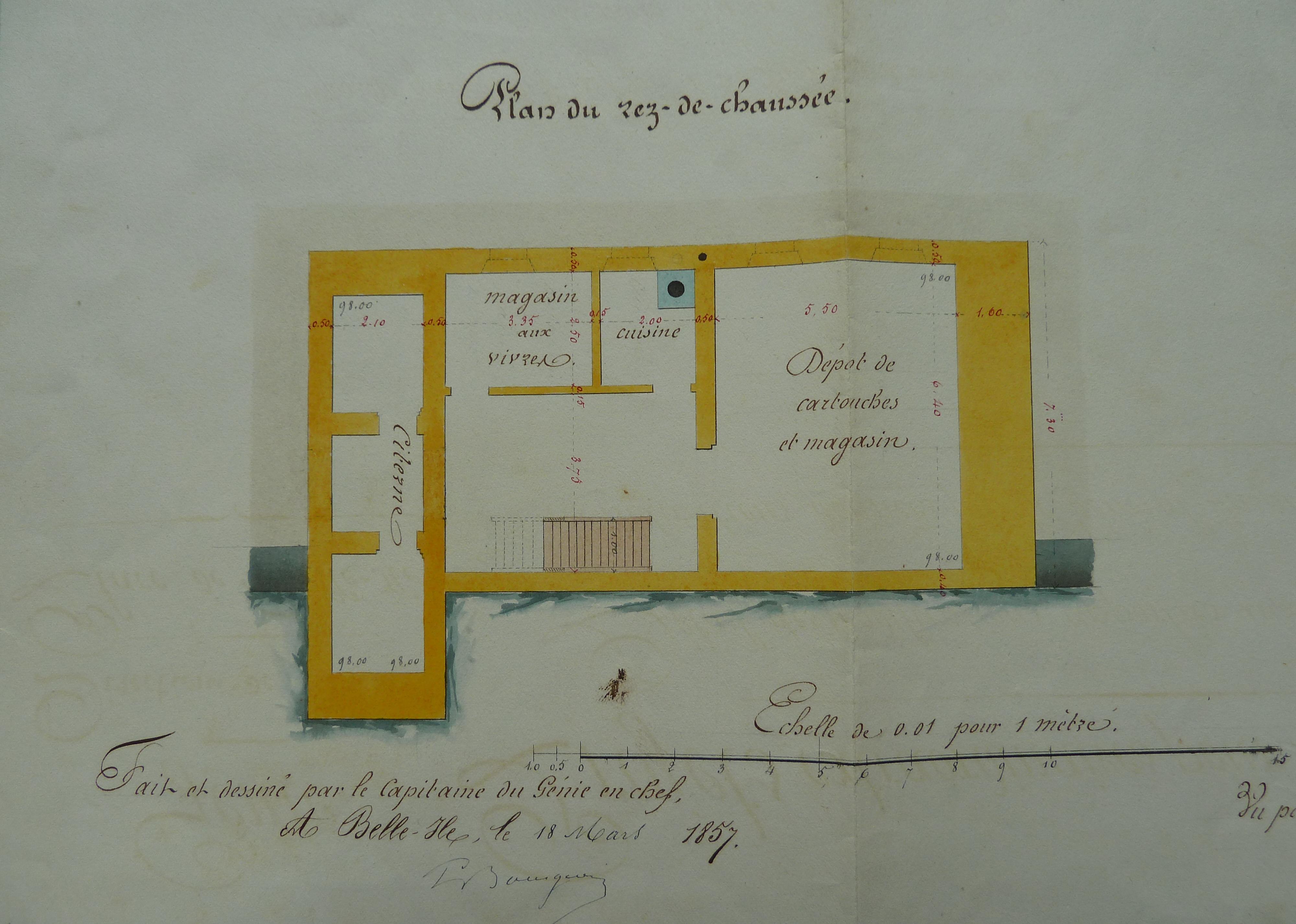 Service historique de la Défense, département Armée de Terre, Vincennes. Archives du Génie ; Article 8, Places françaises et d'Algérie : 1 VH 294, Place de Belle-Île-en-Mer, projets et dépenses annuels, 1854-1857. Direction du Génie de Brest, Place de Belle-Ile, feuille n° 23 des projets extraordinaires pour 1857-1858, détail des modifications apportées aux réduits types, 18 mars 1857.