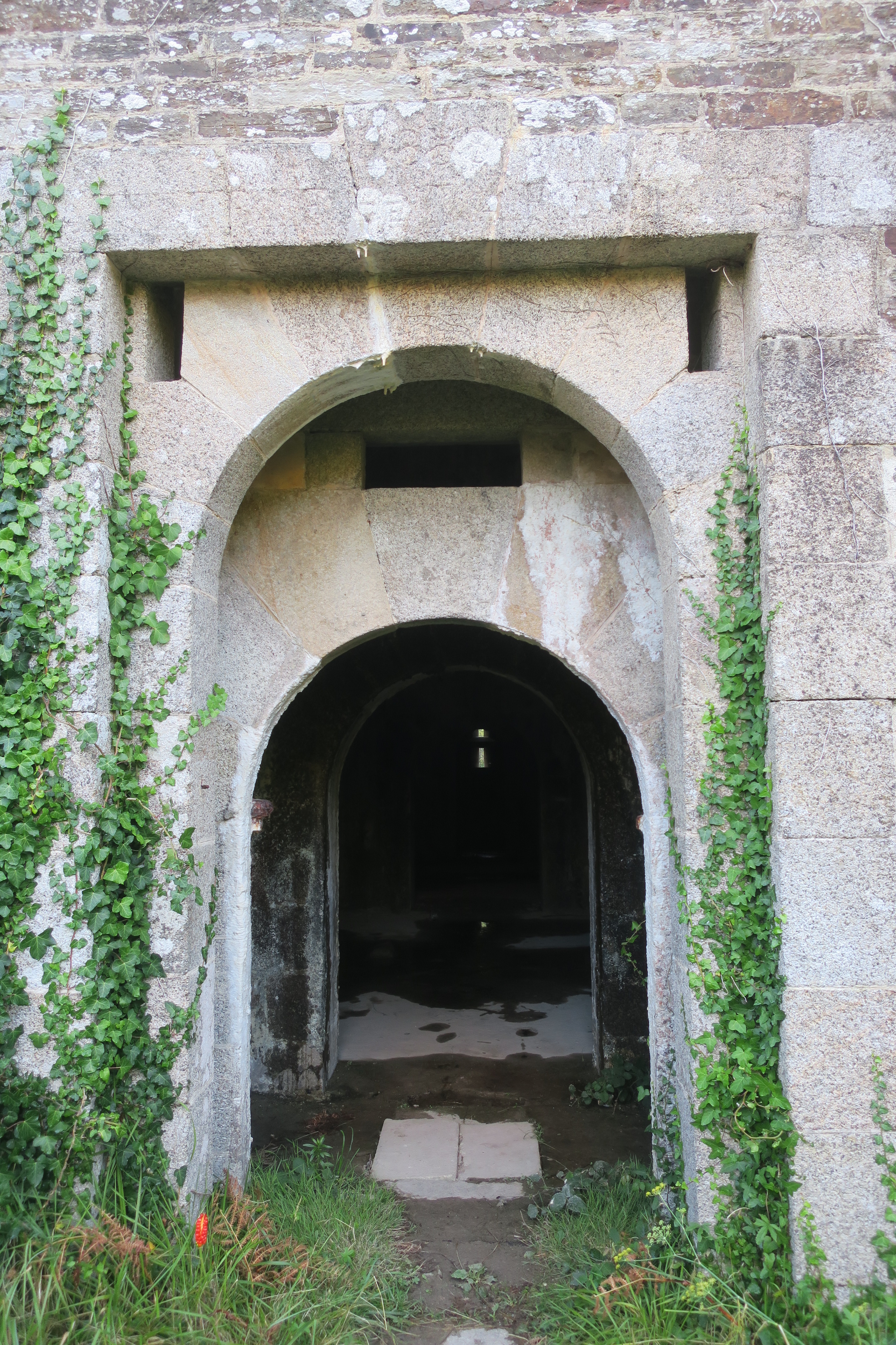 Locmaria, Grands Sables, batterie de La Ferrière, corps de garde crénelé, porte.Immatriculation