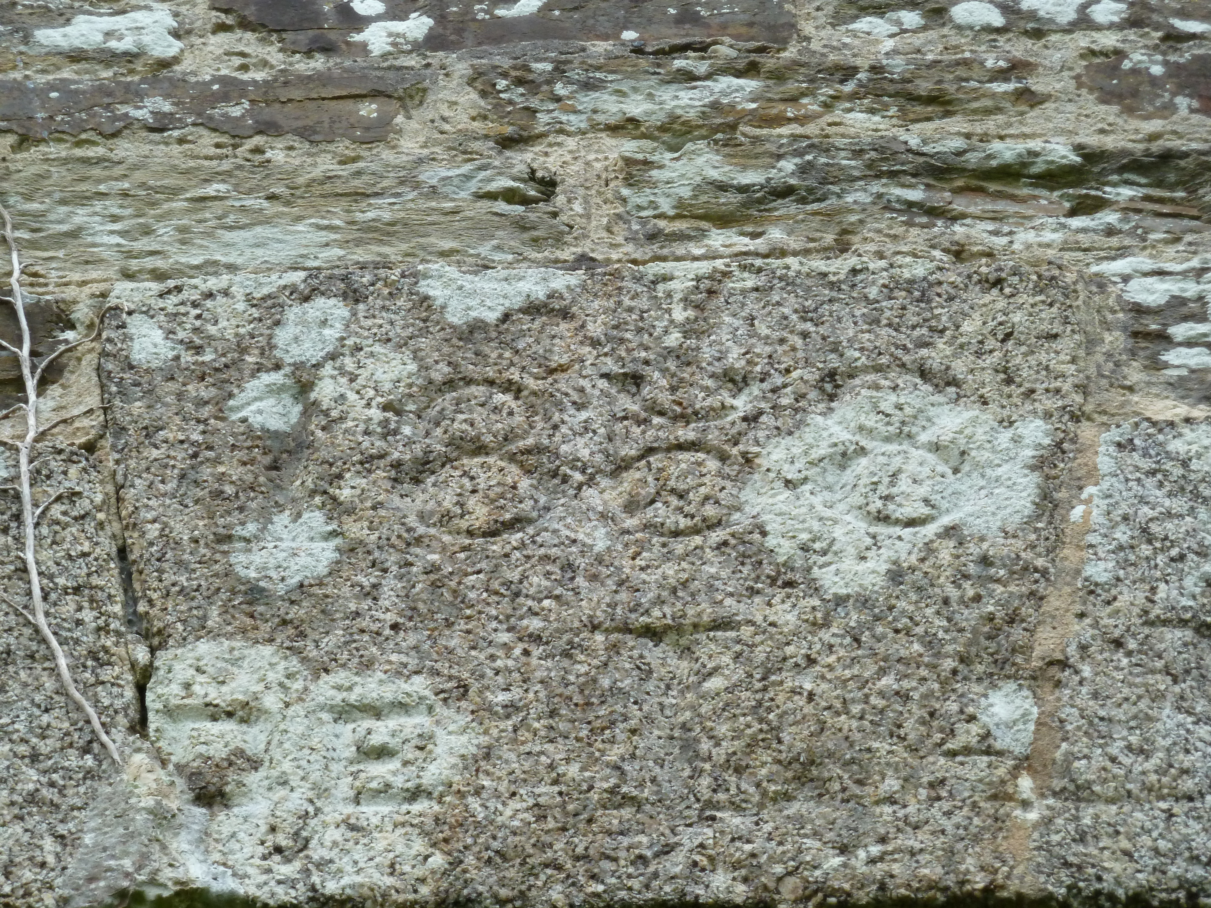 Locmaria, Grands Sables, batterie de La Ferrière, corps de garde crénelé, détail de l'inscription au dessus de la porte.Immatriculation