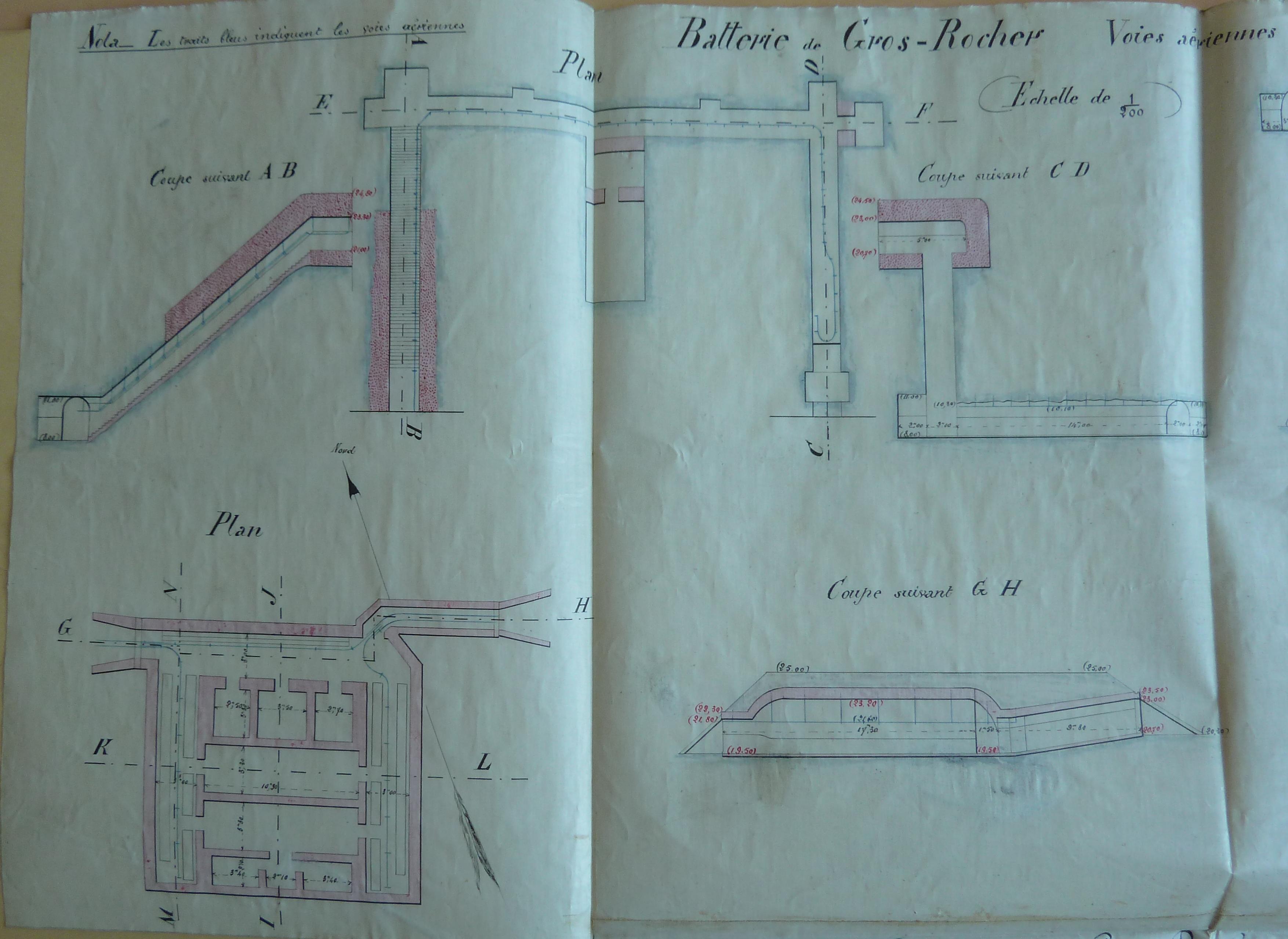 Service historique de la Défense, Département Armée de Terre, Vincennes. Archives de la Guerre, Troisième République ; Sous-série 7 N, État-major de l'Armée : 7 N 1904, Défense des fronts de mer, dossiers de l’inspection générale permanente d’armement des côtes - Atlantique : pièces collectives, Belle-Ile, Blaye, Bordeaux, Brest (1878-1912). Croquis joint au procès-verbal de conférence en date du 30 décembre 1894 relatif à l'emmagasinement des munitions dans les batteries de côte de Belle-Ile.