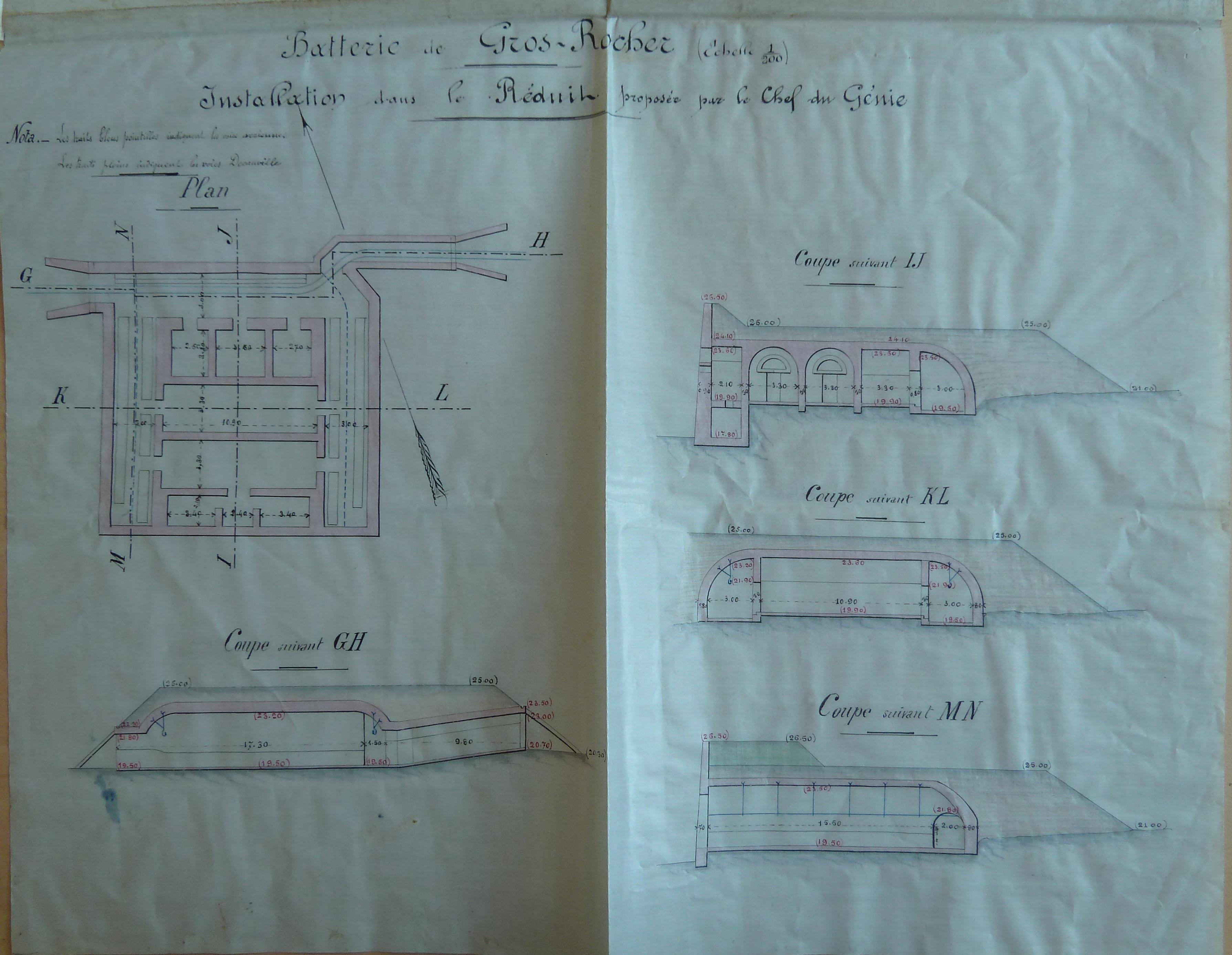 Service historique de la Défense, Département Armée de Terre, Vincennes. Archives de la Guerre, Troisième République ; Sous-série 7 N, État-major de l'Armée : 7 N 1904, Défense des fronts de mer, dossiers de l’inspection générale permanente d’armement des côtes - Atlantique : pièces collectives, Belle-Ile, Blaye, Bordeaux, Brest (1878-1912). Croquis joint au procès-verbal de conférence en date du 30 décembre 1894 relatif à l'emmagasinement des munitions dans les batteries de côte de Belle-Ile.