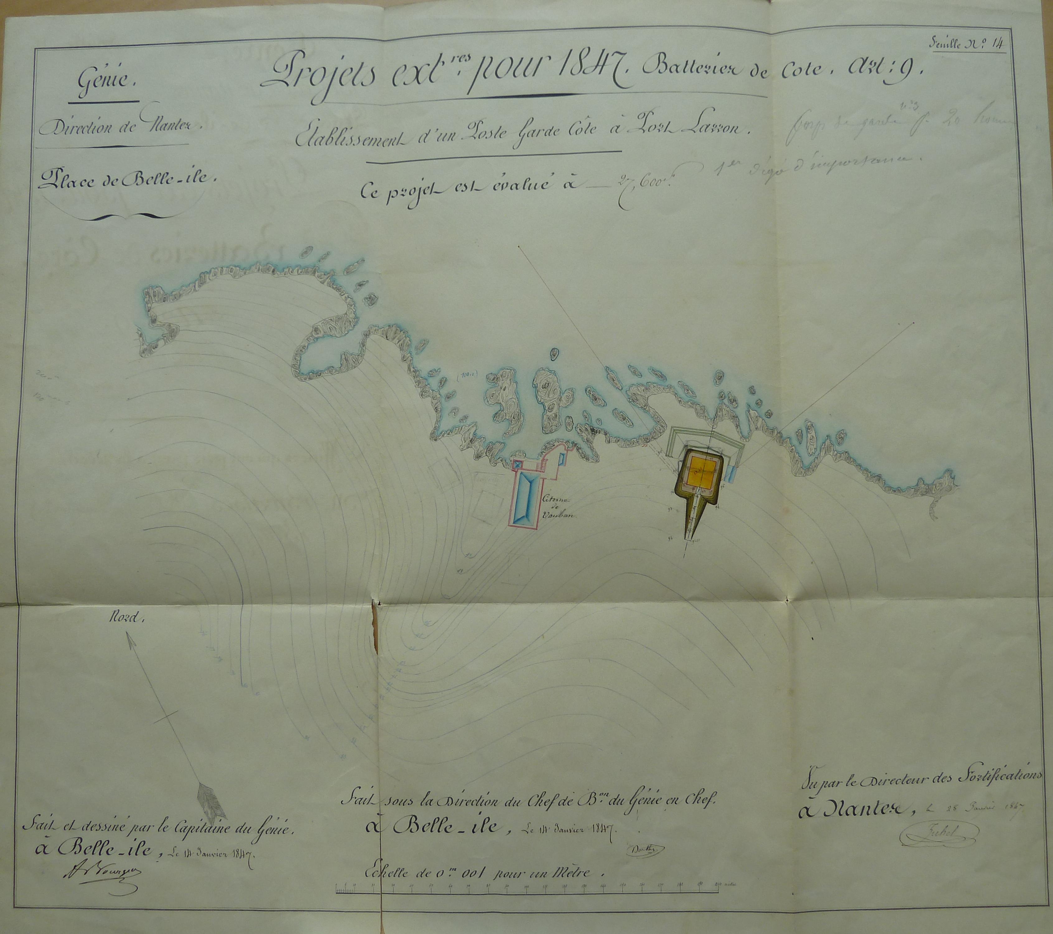 Service historique de la Défense, département Armée de Terre, Vincennes. Archives du Génie ; Article 8, Places françaises et d'Algérie : 1 VH 292, Place de Belle-Île-en-Mer, projets et dépenses annuels, 1847. Direction du Génie de Nantes, Place de Belle-Ile, feuille n° 14 des projets extraordinaires pour 1847, établissement d'un poste garde côte à Port Larron, 14 janvier 1847.