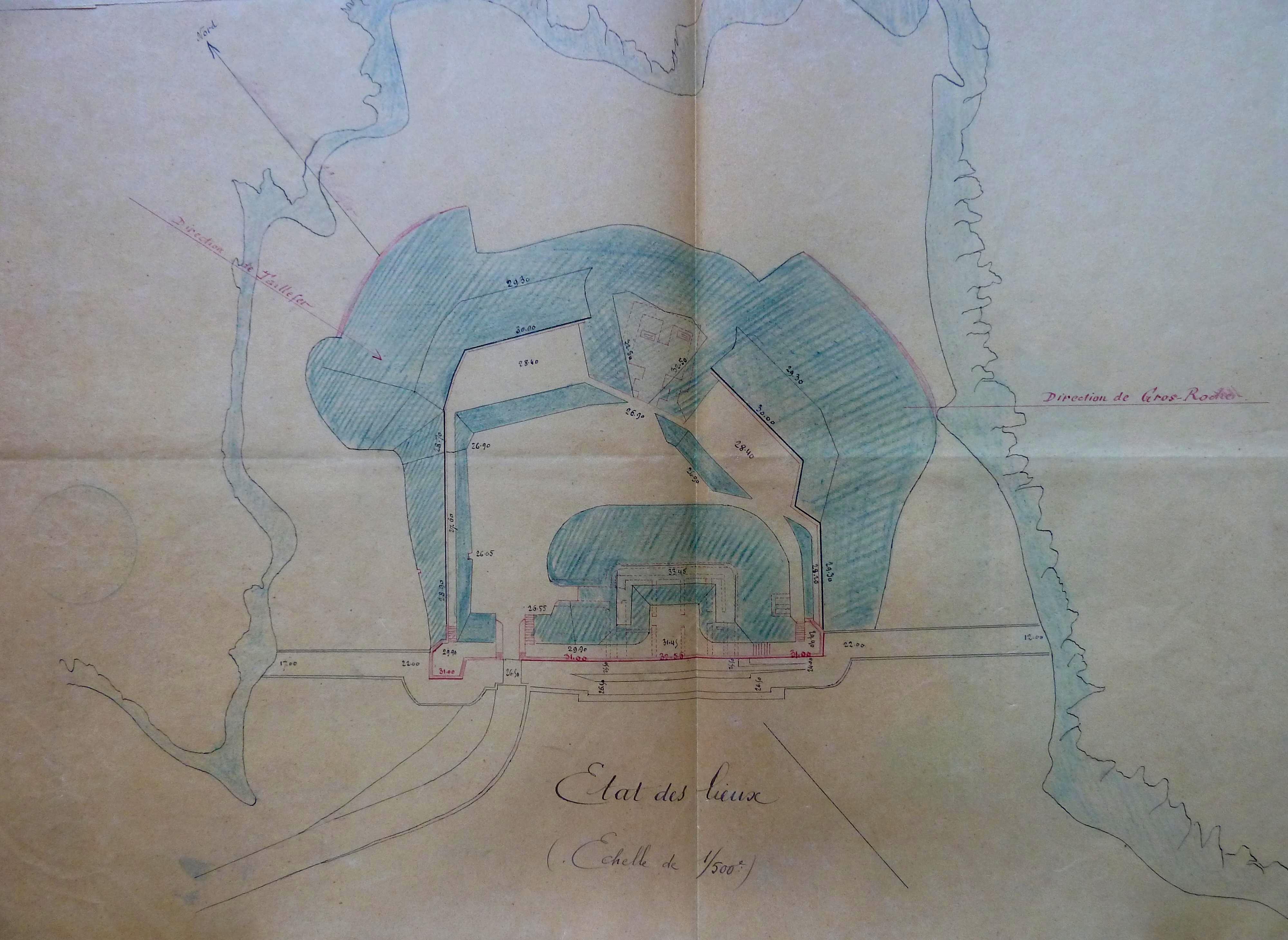 Service historique de la Défense, Département Armée de Terre, Vincennes. Archives de la Guerre, Troisième République ; Sous-série 7 N, État-major de l'Armée : 7 N 1904, Défense des fronts de mer, dossiers de l’inspection générale permanente d’armement des côtes - Atlantique : pièces collectives, Belle-Ile, Blaye, Bordeaux, Brest (1878-1912). Croquis joint à l'avis commun des Inspecteurs permanents au sujet de la réorganisation des batteries de côte de Belle-Ile, 23 mai 1891.