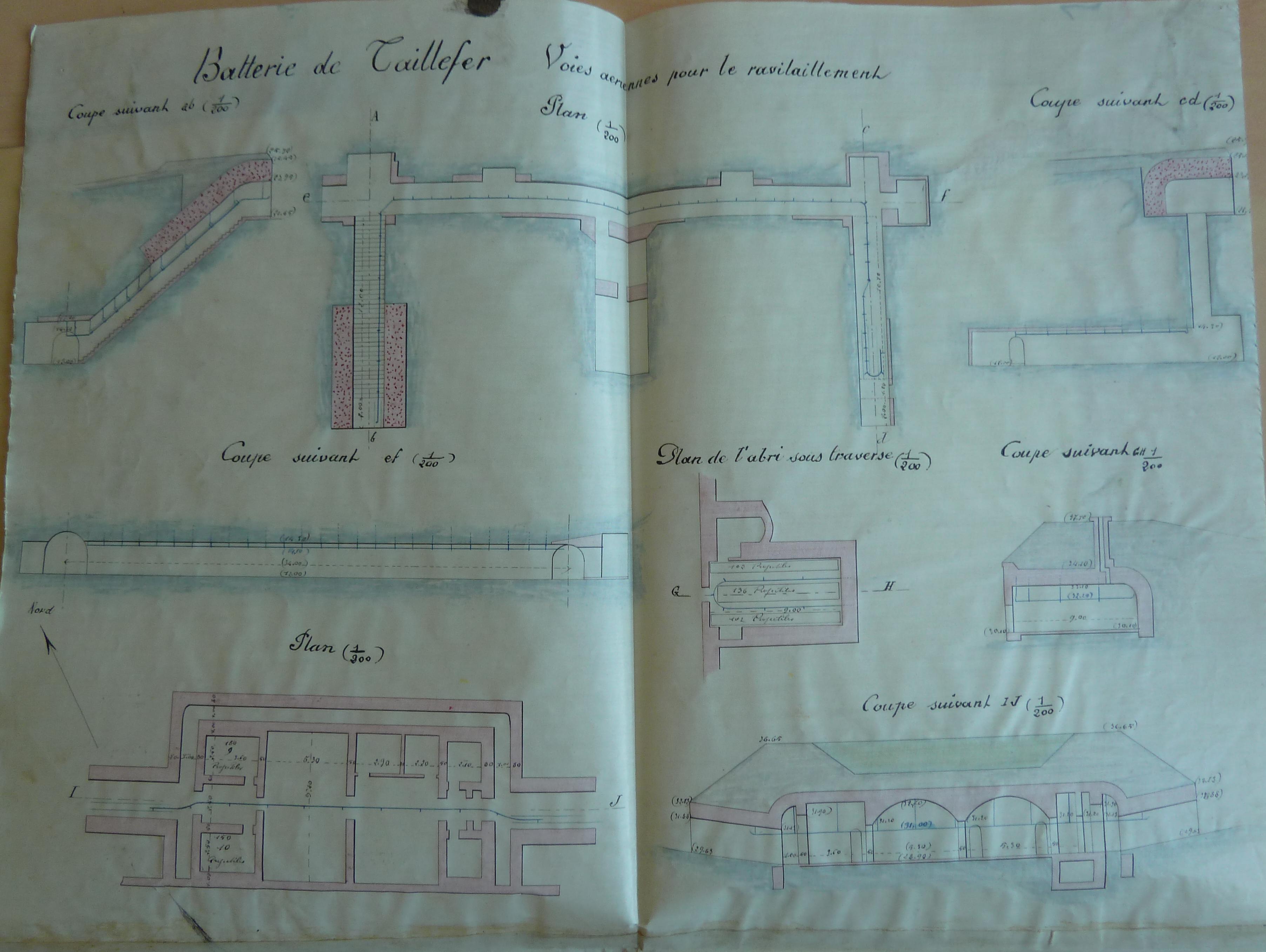 Service historique de la Défense, Département Armée de Terre, Vincennes. Archives de la Guerre, Troisième République ; Sous-série 7 N, État-major de l'Armée : 7 N 1904, Défense des fronts de mer, dossiers de l’inspection générale permanente d’armement des côtes - Atlantique : pièces collectives, Belle-Ile, Blaye, Bordeaux, Brest (1878-1912). Croquis joint au procès-verbal de conférence en date du 30 décembre 1894 relatif à l'emmagasinement des munitions dans les batteries de côte de Belle-Ile.