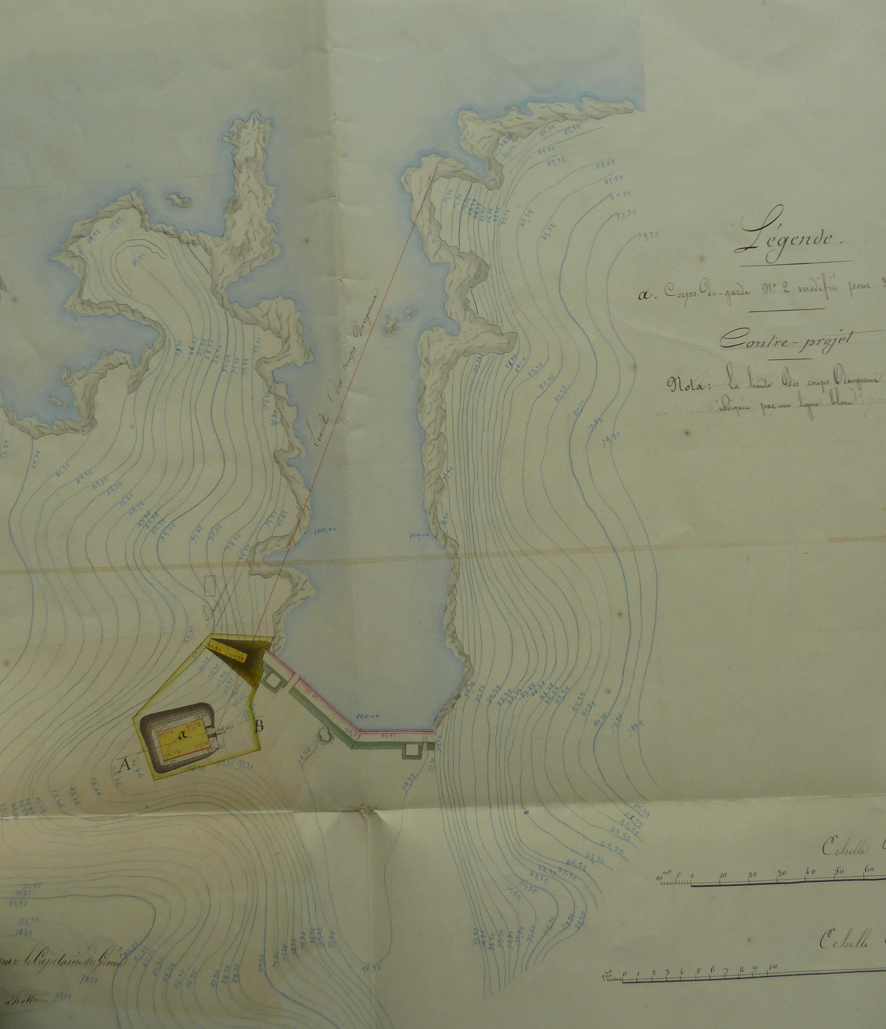Service historique de la Défense, département Armée de Terre, Vincennes. Archives du Génie ; Article 8, Places françaises et d'Algérie : 1 VH 294, Place de Belle-Île-en-Mer, projets et dépenses annuels, 1854-1857. Direction du Génie de Brest, Place de Belle-Ile, feuille n° 14 des projets extraordinaires pour 1857-1858, 19 février 1857 [papillotte de correction du 18 mars 1857].
