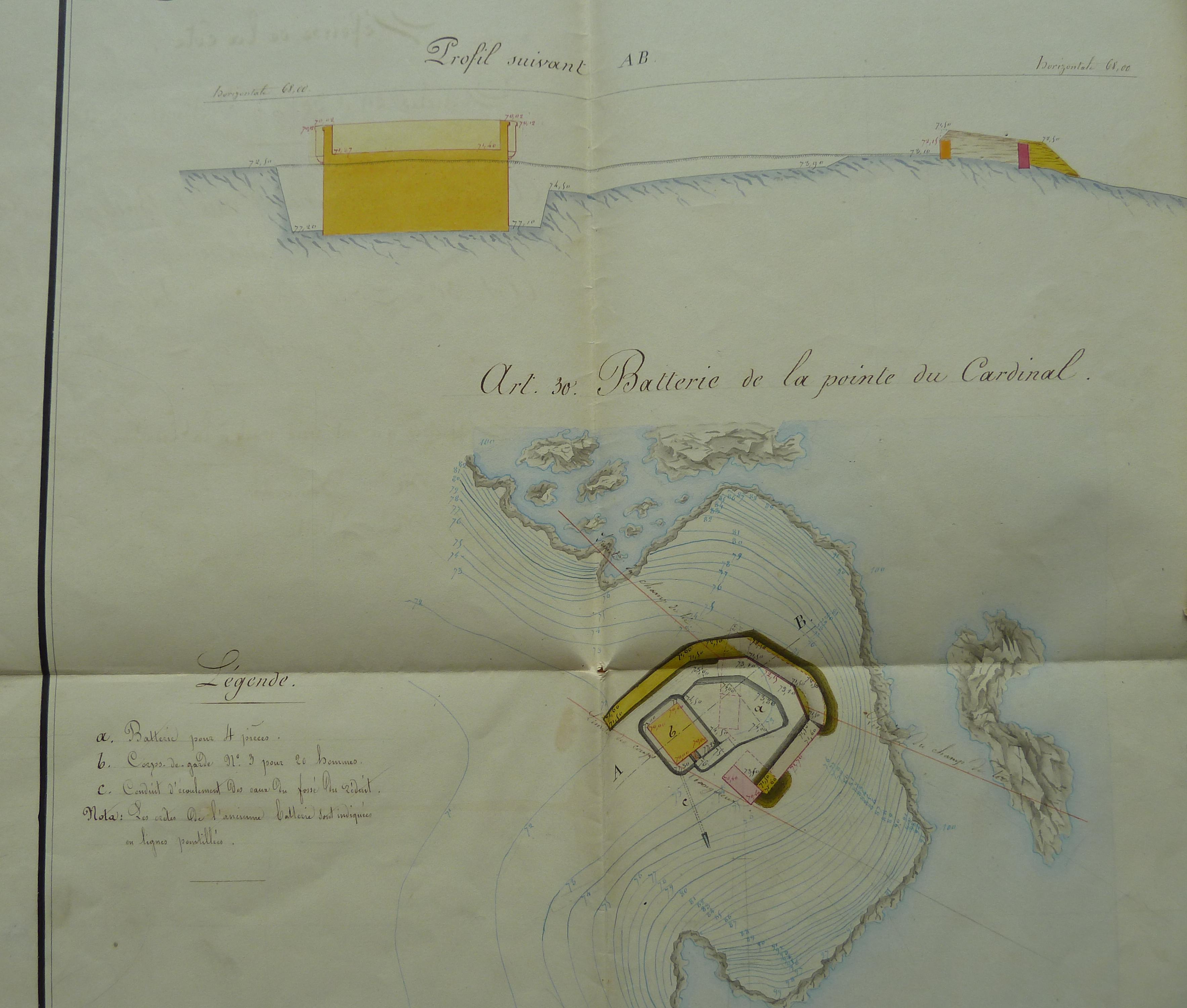 Service historique de la Défense, département Armée de Terre, Vincennes. Archives du Génie ; Article 8, Places françaises et d'Algérie : 1 VH 294, Place de Belle-Île-en-Mer, projets et dépenses annuels, 1854-1857. Direction du Génie de Brest, Place de Belle-Ile, feuille n° 15 des projets extraordinaires pour 1857-1858, 19 février 1857.
