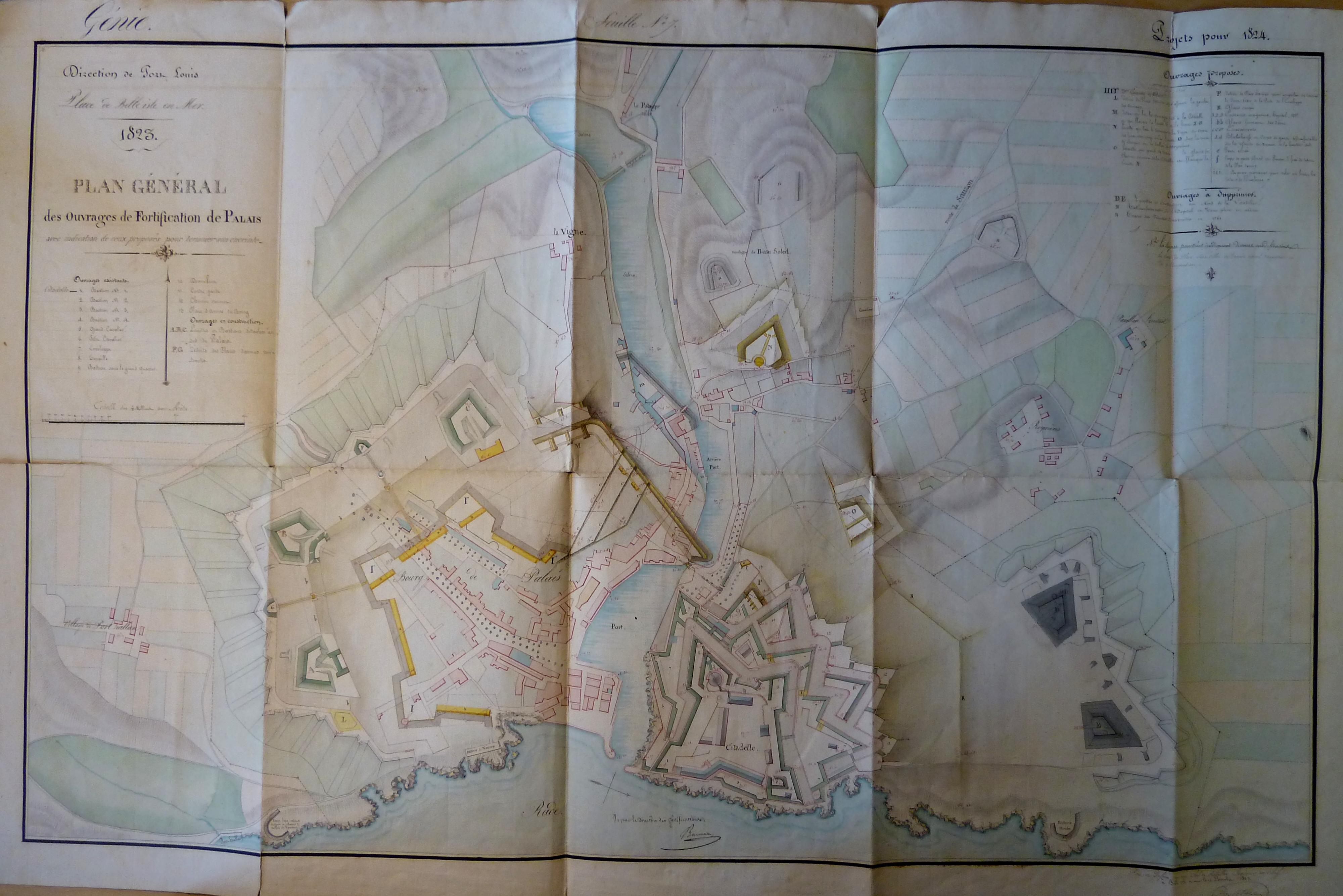Service historique de la Défense, département Armée de Terre, Vincennes. Archives du Génie ; Article 8, Places françaises et d'Algérie : 1 VH 287, Place de Belle-Île-en-Mer, projets et dépenses annuels, 1817-1825. Direction du Génie de Port-Louis, Place de Belle-isle-en-Mer, projets pour 1824, plan général des ouvrages de fortification de Palais, 1823.