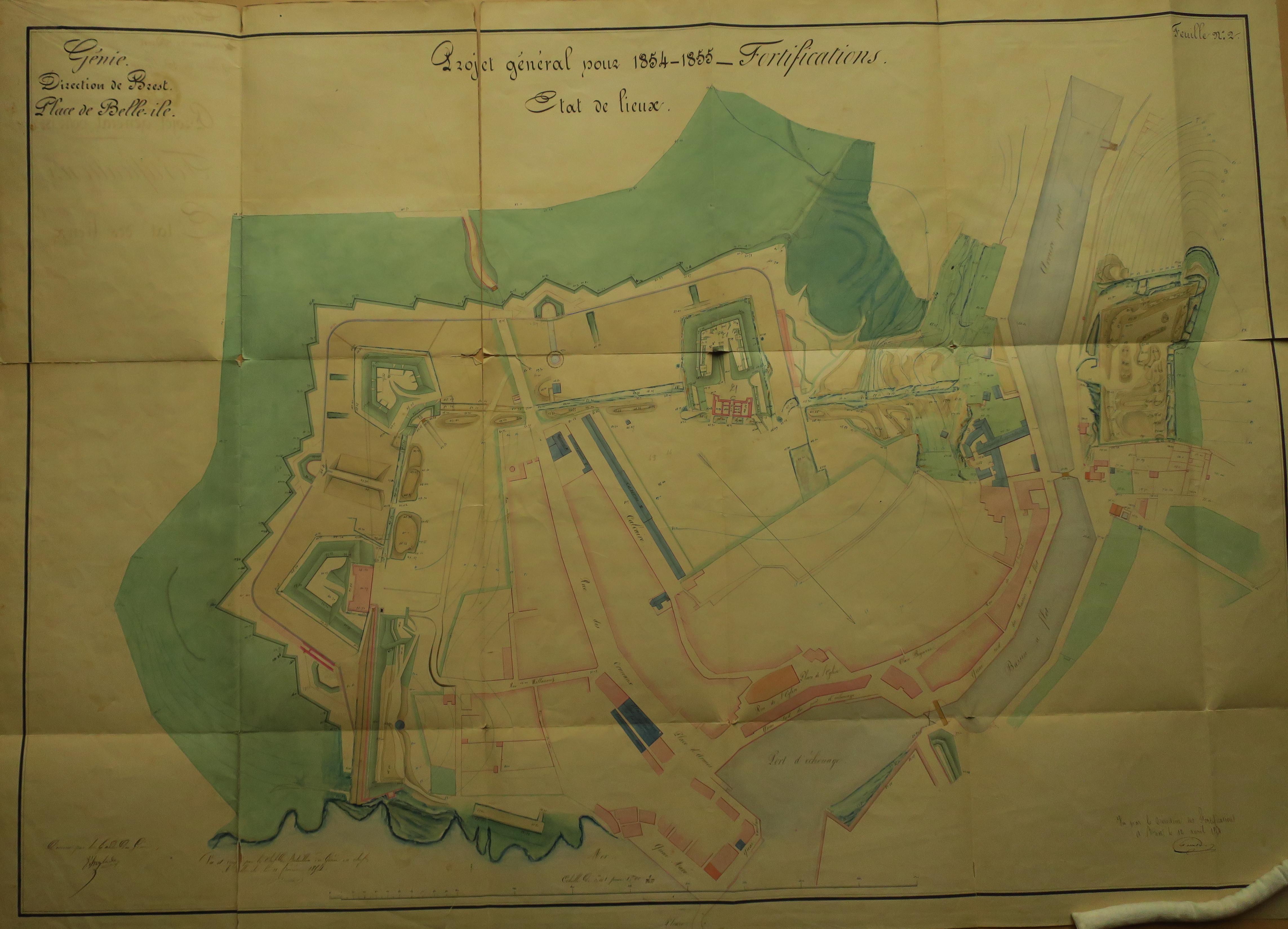 Service historique de la Défense, département Armée de Terre, Vincennes. Archives du Génie ; Article 8, Places françaises et d'Algérie : 1 VH 294, Place de Belle-Île-en-Mer, projets et dépenses annuels, 1854-1857. Direction du Génie de Brest, Place de Belle-Ile, feuille n° 2 des projets pour 1854-1855, état des lieux, 11 février 1854.