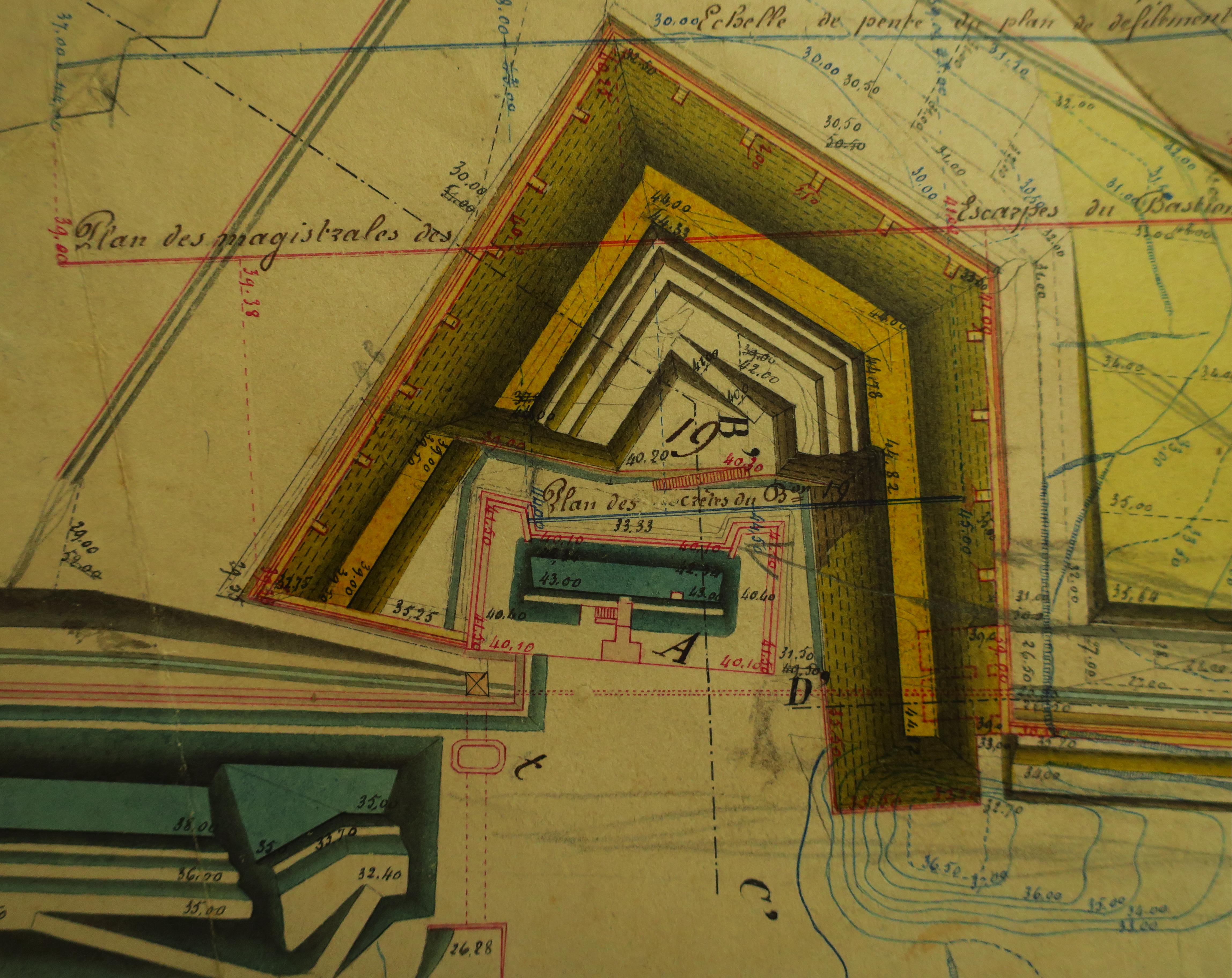 Service historique de la Défense, département Armée de Terre, Vincennes. Archives du Génie ; Article 8, Places françaises et d'Algérie : 1 VH 295, Place de Belle-Île-en-Mer, projets et dépenses annuels, 1858-1859. Direction du Génie de Brest, Place de Belle-Ile, feuille n° 6 des projets pour 1858-1859, 29 décembre 1857.