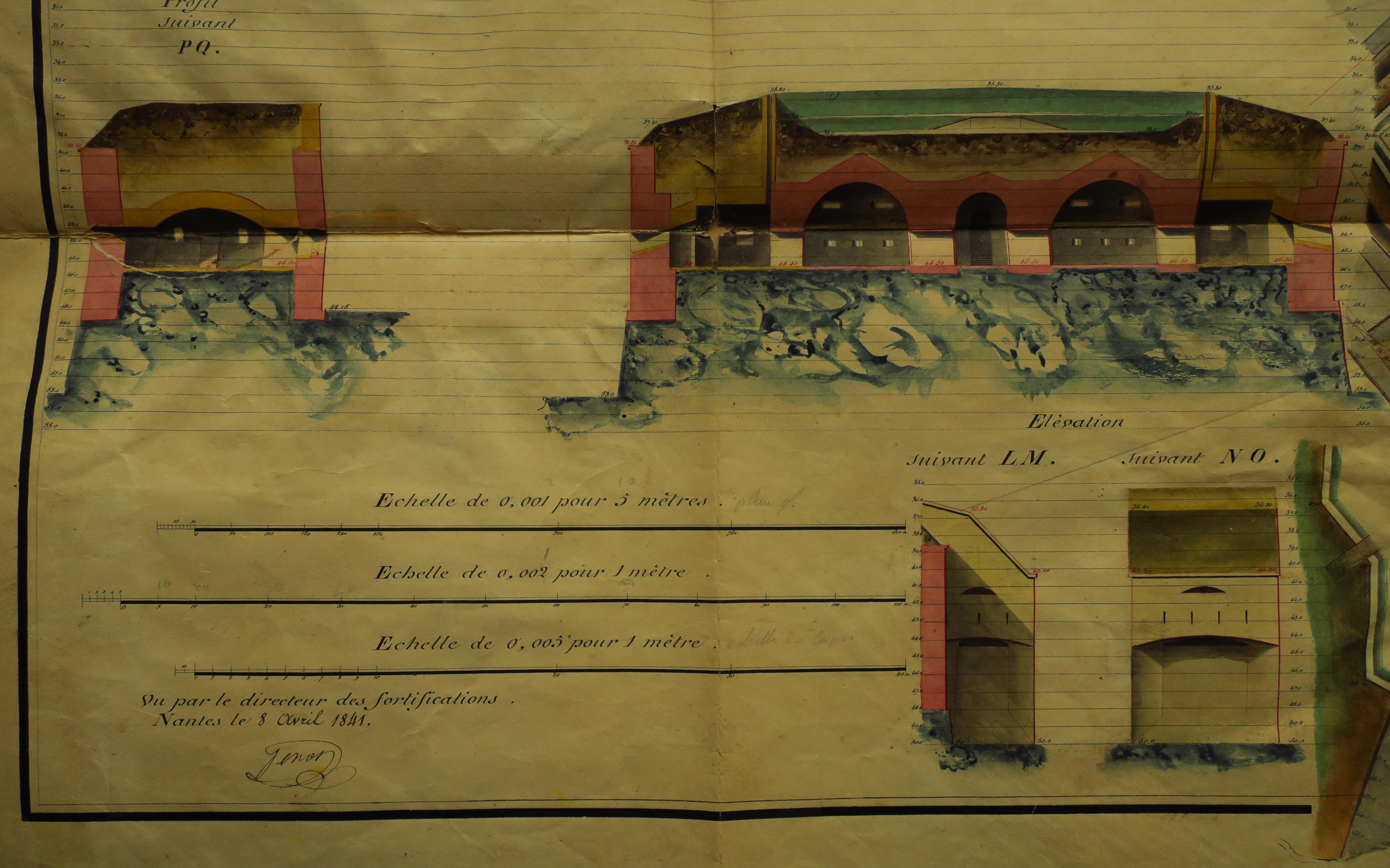 Service historique de la Défense, département Armée de Terre, Vincennes. Archives du Génie ; Article 8, Places françaises et d'Algérie : 1 VH 290, Place de Belle-Île-en-Mer, projets et dépenses annuels, 1837-1842. Direction du Génie de Nantes, Place de Belle-Ile, feuille n° 4 des projets pour 1841, achèvement de l'enceinte de Palais, 27 février 1841.