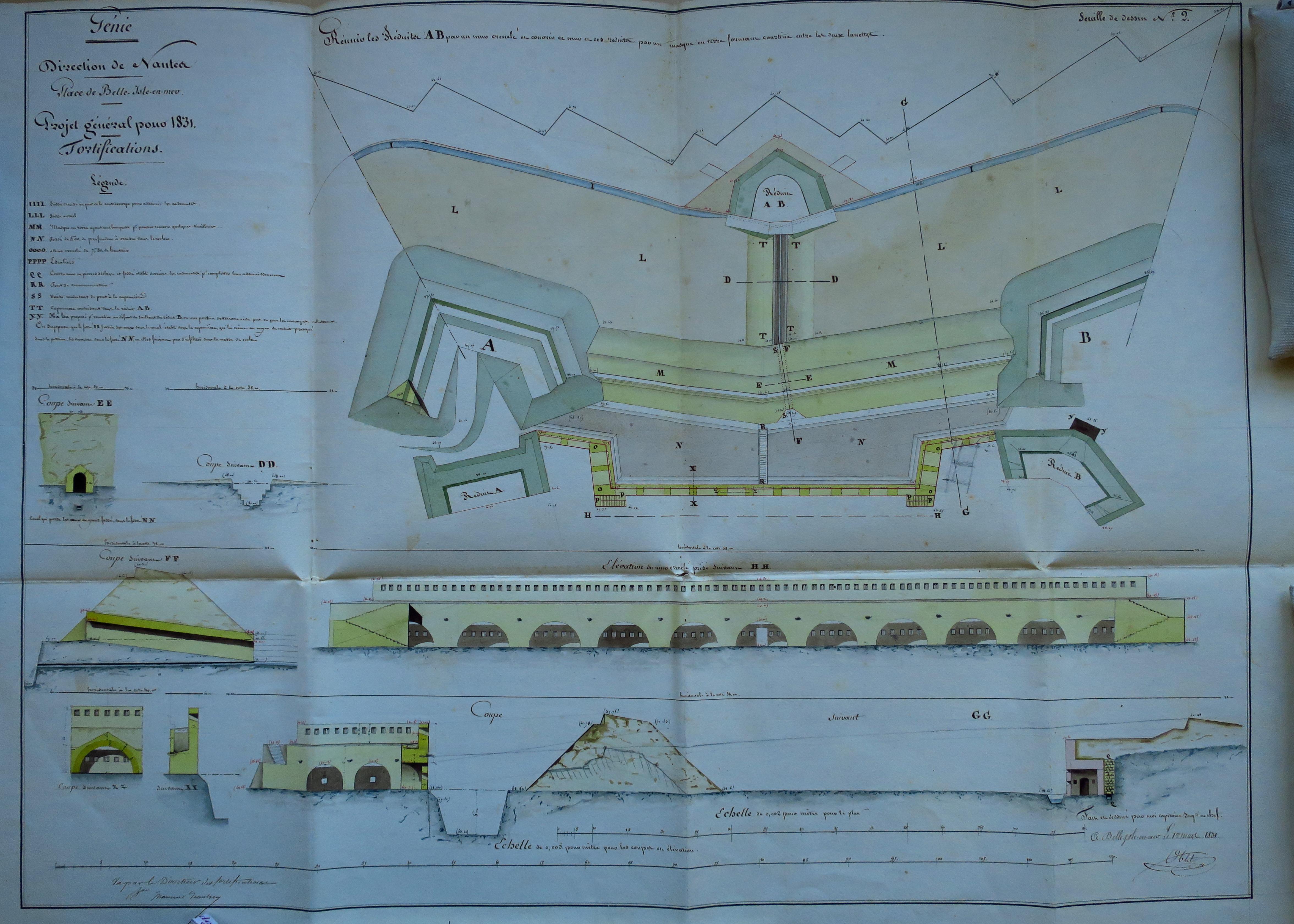 Service historique de la Défense, département Armée de Terre, Vincennes. Archives du Génie ; Article 8, Places françaises et d'Algérie : 1 VH 289, Place de Belle-Île-en-Mer, projets et dépenses annuels, 1831-1836. Direction du Génie de Nantes, Place de Belle-Ile, feuille n° 2 des projets pour 1831, réunir les réduits A B par un mur crénelé et couvrir ce mur et ces réduits par un masque de terre formant courtine entre les deux lunettes, 1er mars 1831.