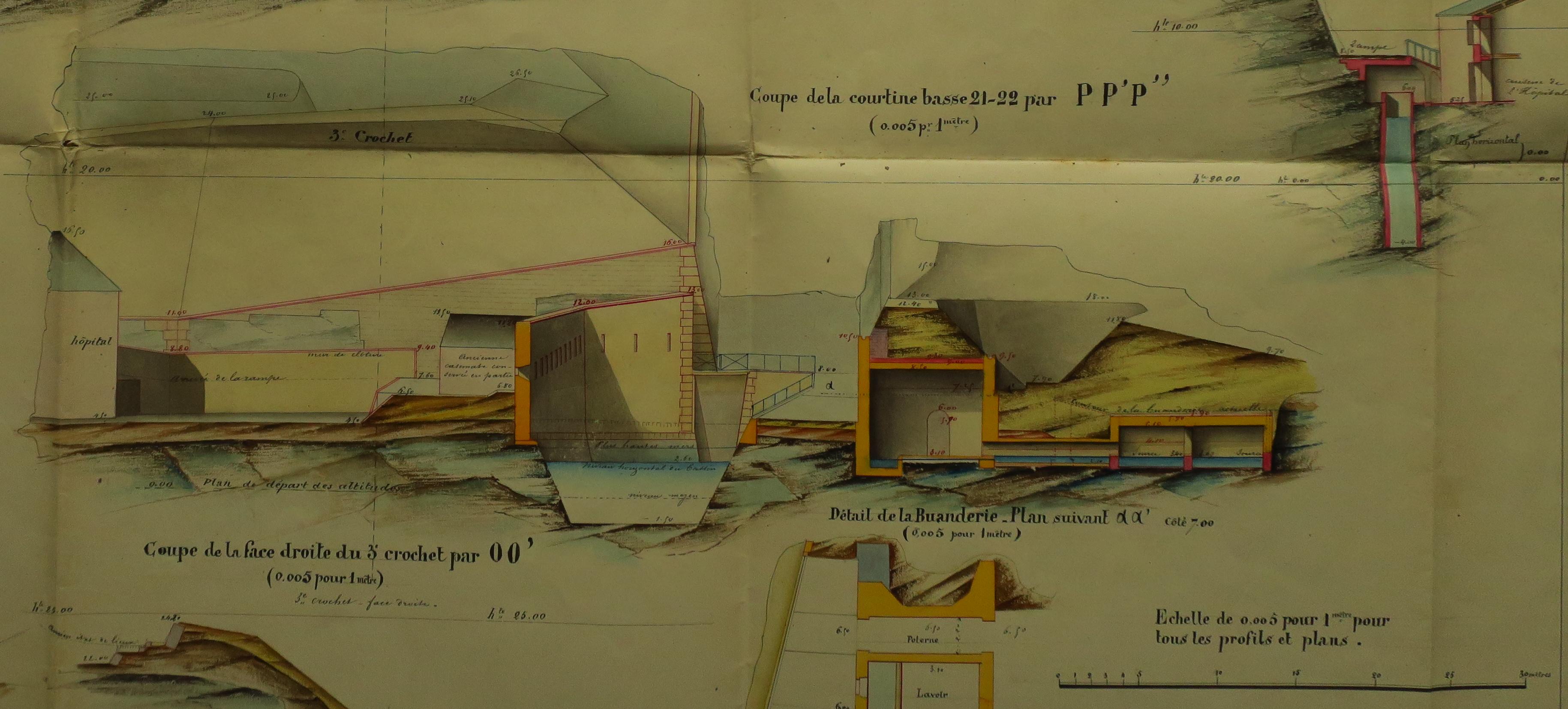 Service historique de la Défense, département Armée de Terre, Vincennes. Archives du Génie ; Article 8, Places françaises et d'Algérie : 1 VH 297, Place de Belle-Île-en-Mer, projets et dépenses annuels, 1862-1875. Direction du Génie de Brest, Place de Belle-Ile, feuille n° 4 des projets pour 1866-1867, courtine 21-22, 7 mars 1866.