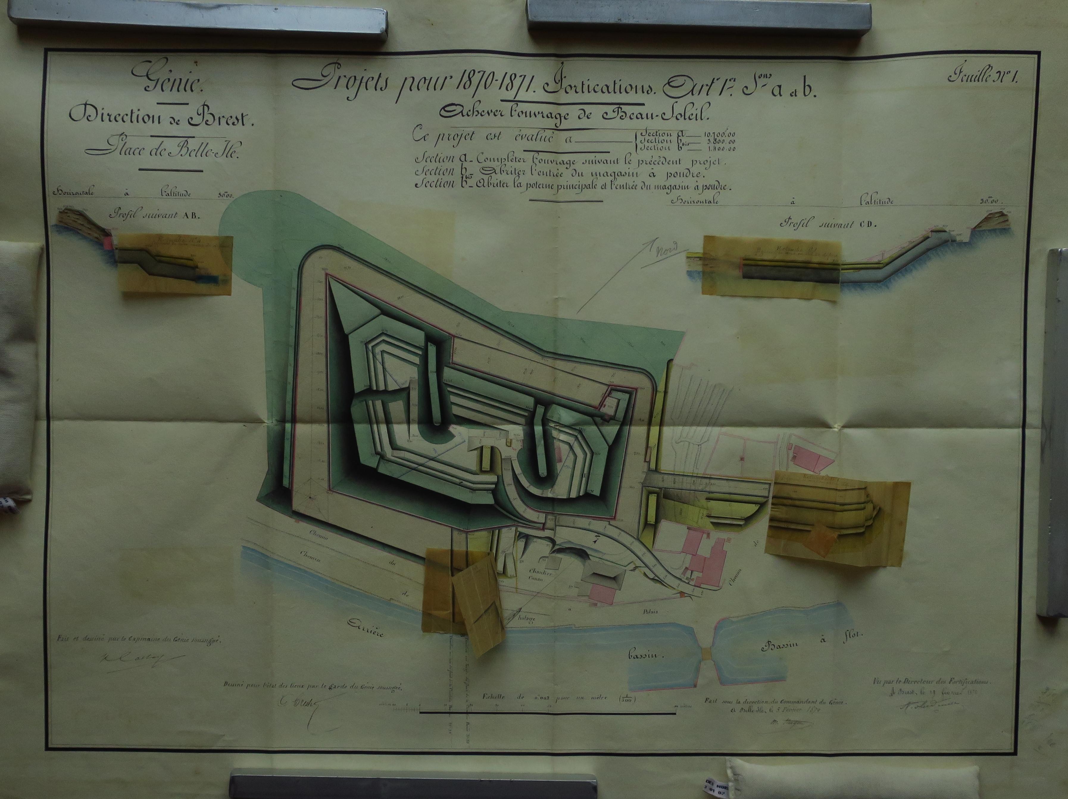 Service historique de la Défense, département Armée de Terre, Vincennes. Archives du Génie ; Article 8, Places françaises et d'Algérie : 1 VH 297, Place de Belle-Île-en-Mer, projets et dépenses annuels, 1862-1875. Direction du Génie de Brest, Place de Belle-Ile, feuille n° 1 des projets pour 1870-1871, achever l'ouvrage de Beau-Soleil, 5 février 1870.