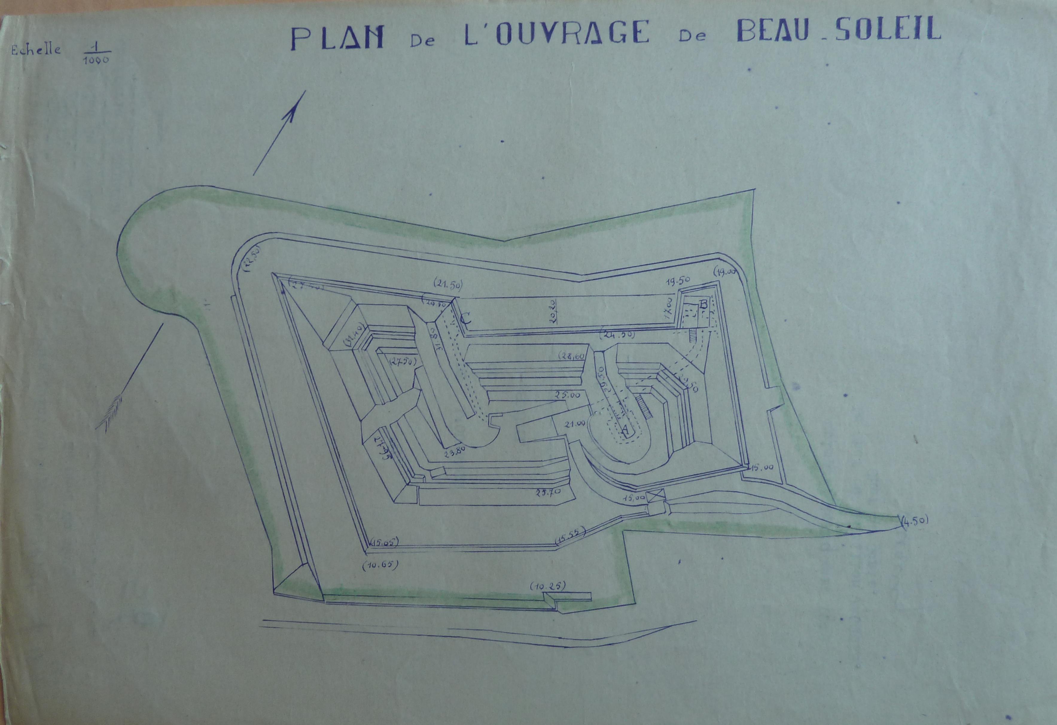 Service historique de la Défense, département Armée de Terre, Vincennes. Archives du Génie ; sous-série 3V, inspection du génie : 3 V 769, Commission de déclassement et d'aliénation d'ouvrages anciens, 1946-1947. Belle-Île, plan de l'ouvrage de Beau-Soleil.