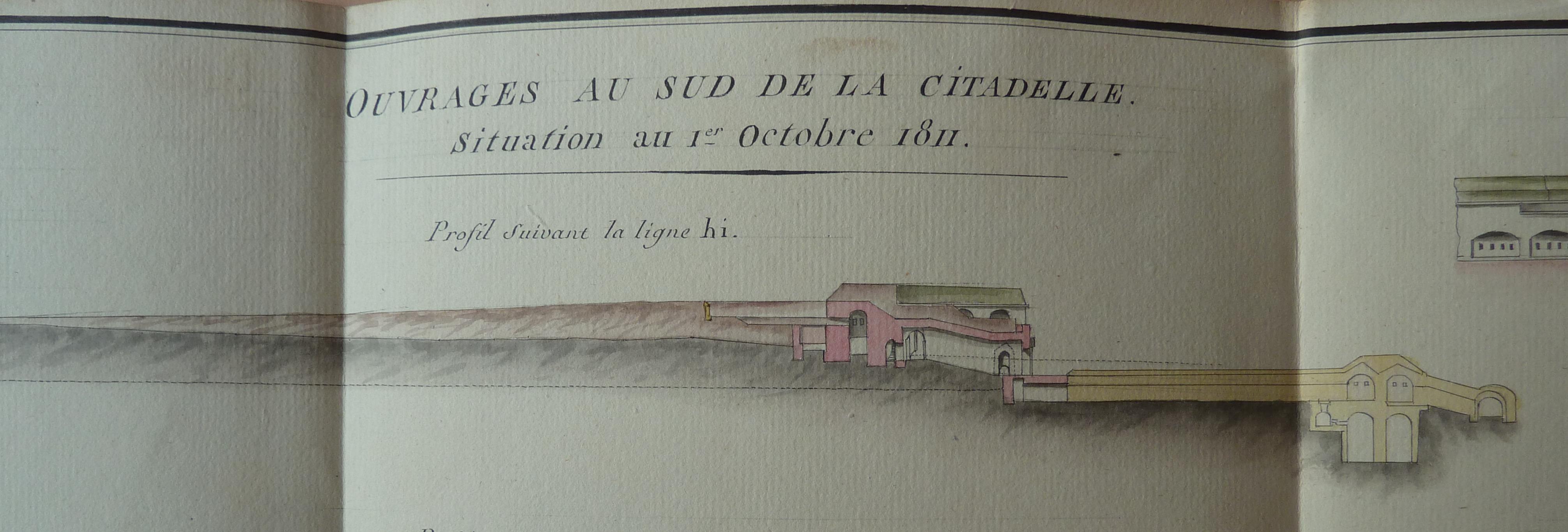 Service historique de la Défense, département Armée de Terre, Vincennes. Archives du Génie ; Article 8, Places françaises et d'Algérie : 1 VH 286, Place de Belle-Île-en-Mer, projets et dépenses annuels, 1807-1816. Direction du Génie de Port-Louis, Place de Belle-Ile-en-Mer, ouvrages au sud de la citadelle, situation au 1er octobre 1811, profils.
