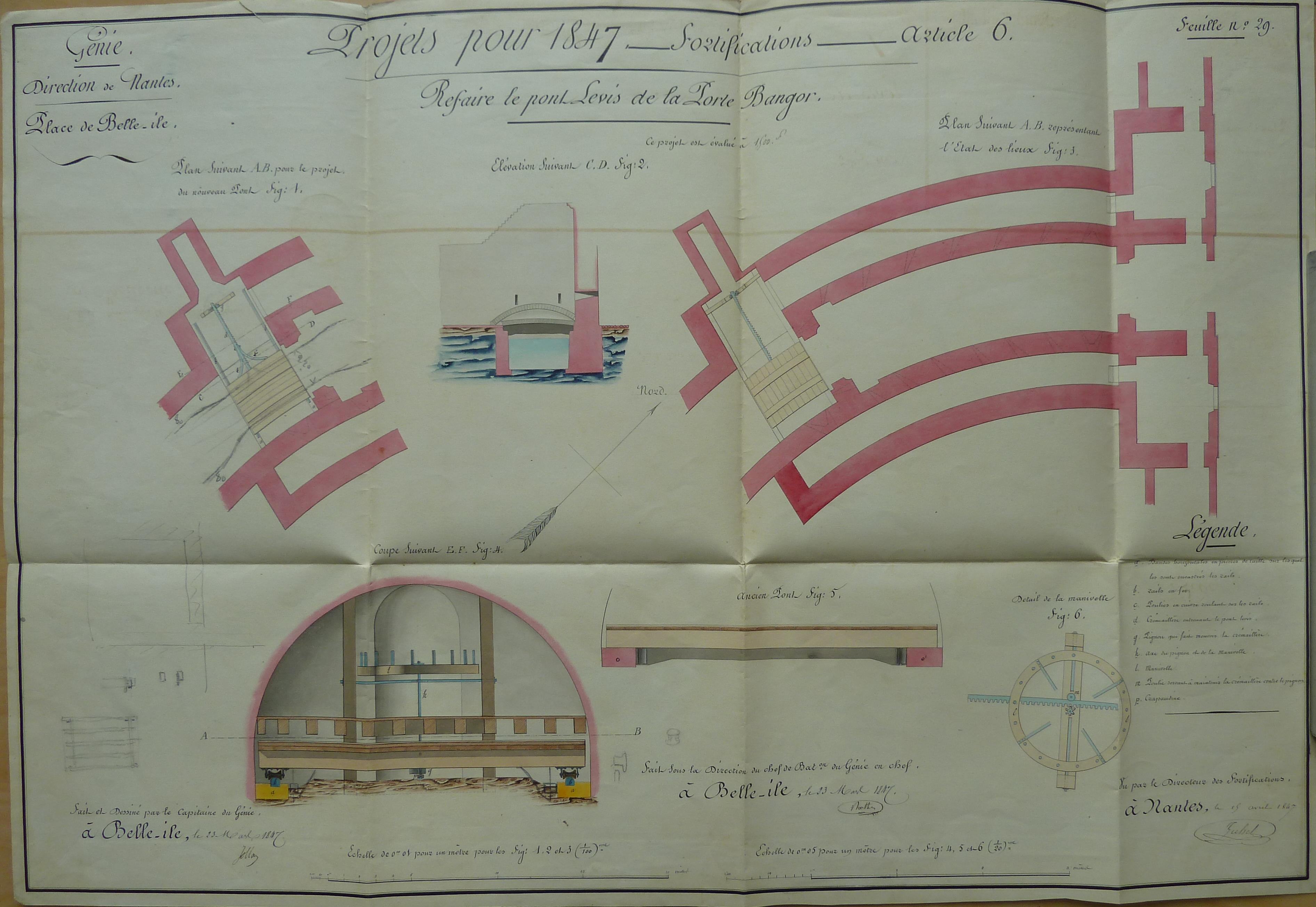 Service historique de la Défense, département Armée de Terre, Vincennes. Archives du Génie ; Article 8, Places françaises et d'Algérie : 1 VH 292, Place de Belle-Île-en-Mer, projets et dépenses annuels, 1847. Direction du Génie de Nantes, Place de Belle-Ile, feuille n° 29 des projets pour 1847, refaire le pont-levis de la porte Bangor, 23 mars 1847.