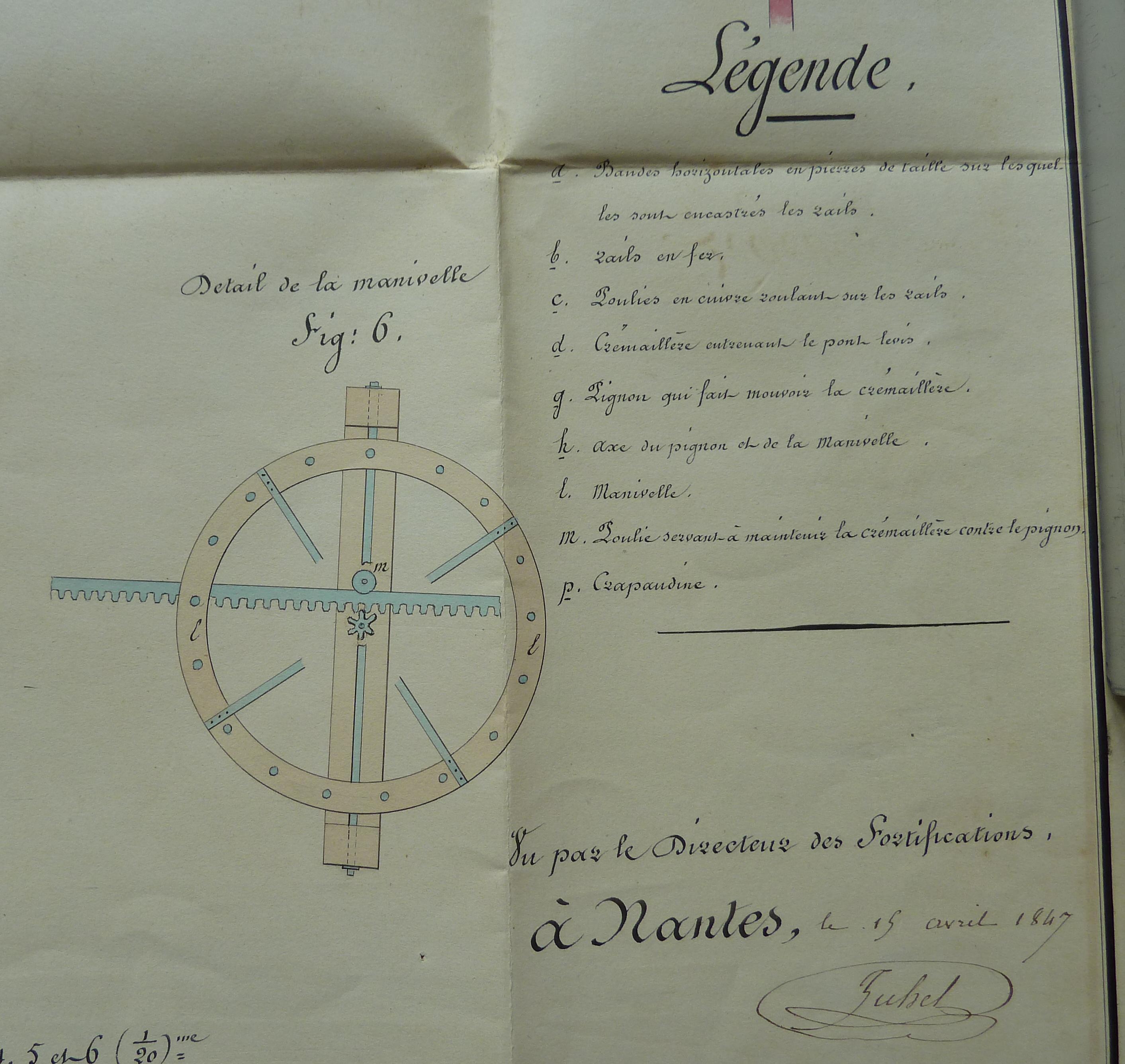 Service historique de la Défense, département Armée de Terre, Vincennes. Archives du Génie ; Article 8, Places françaises et d'Algérie : 1 VH 292, Place de Belle-Île-en-Mer, projets et dépenses annuels, 1847. Direction du Génie de Nantes, Place de Belle-Ile, feuille n° 29 des projets pour 1847, refaire le pont-levis de la porte Bangor, 23 mars 1847.