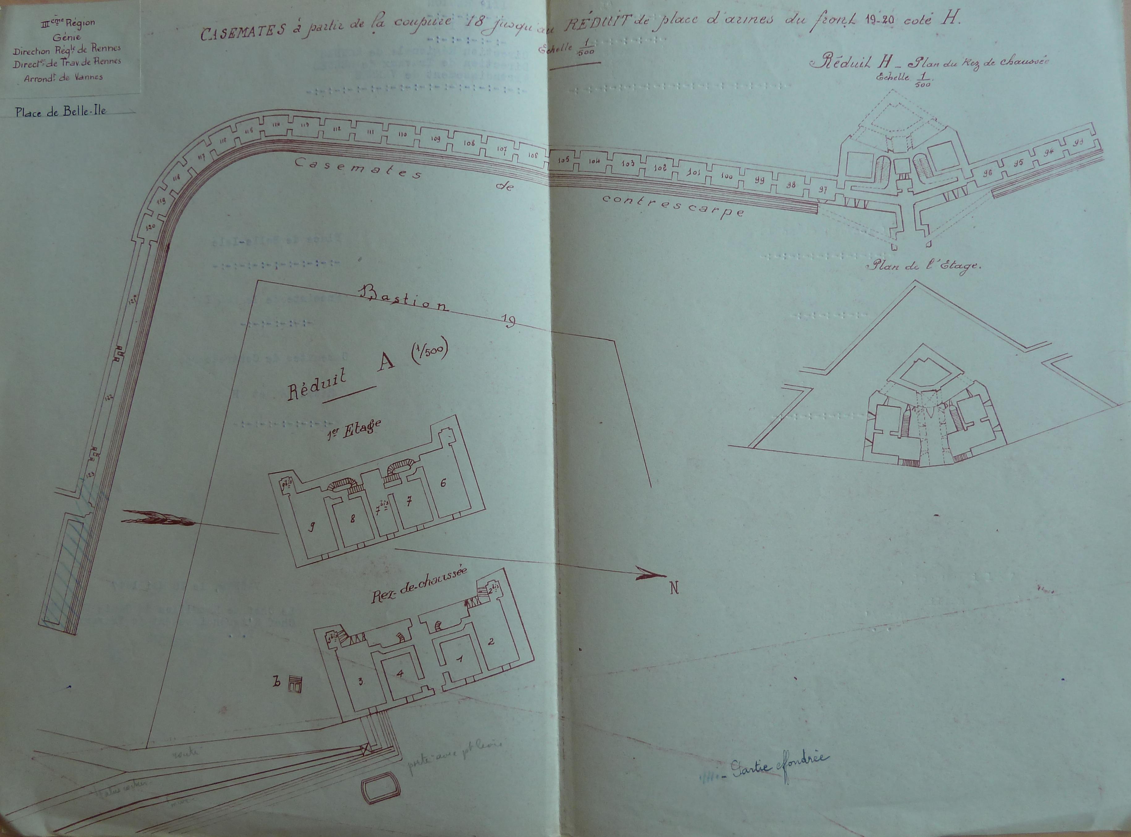 Service historique de la Défense, département Armée de Terre, Vincennes. Archives du Génie ; sous-série 3V, inspection du génie : 3 V 769, Commission de déclassement et d'aliénation d'ouvrages anciens, 1946-1947. Belle-Île, plan des casemates de contrescarpe et des réduits A et H.