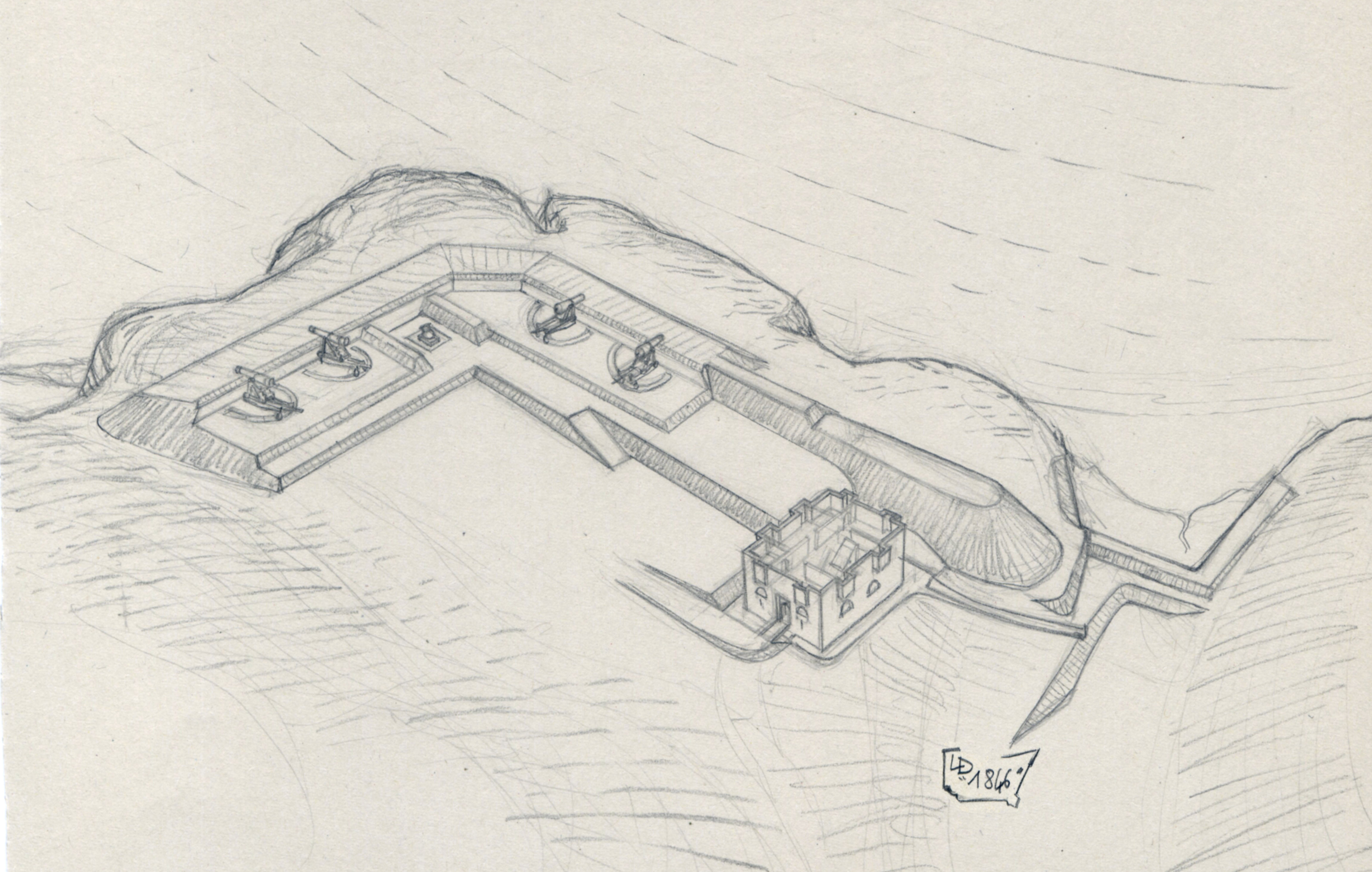 Locmaria, batterie de la Biche, évocation vers 1870 avec l'artillerie en place, par Lionel Duigou.Immatriculation
