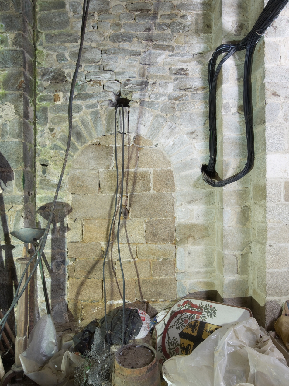 Deuxième niveau de la tour Hasting, élévation nord, porte romane (?) murée en granite (donnant actuellement au niveau du premier étage de la sacristie)Immatriculation