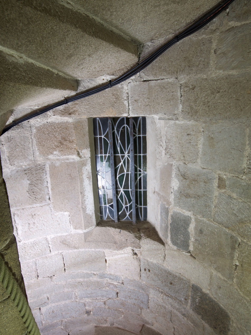 Tourelle d'escalier de la tour Hasting, détail d'un jour (donnant vers la cathédrale, au-dessus de la porte d'accès). La mise en oeuvre associe schiste tuffacé et graniteImmatriculation