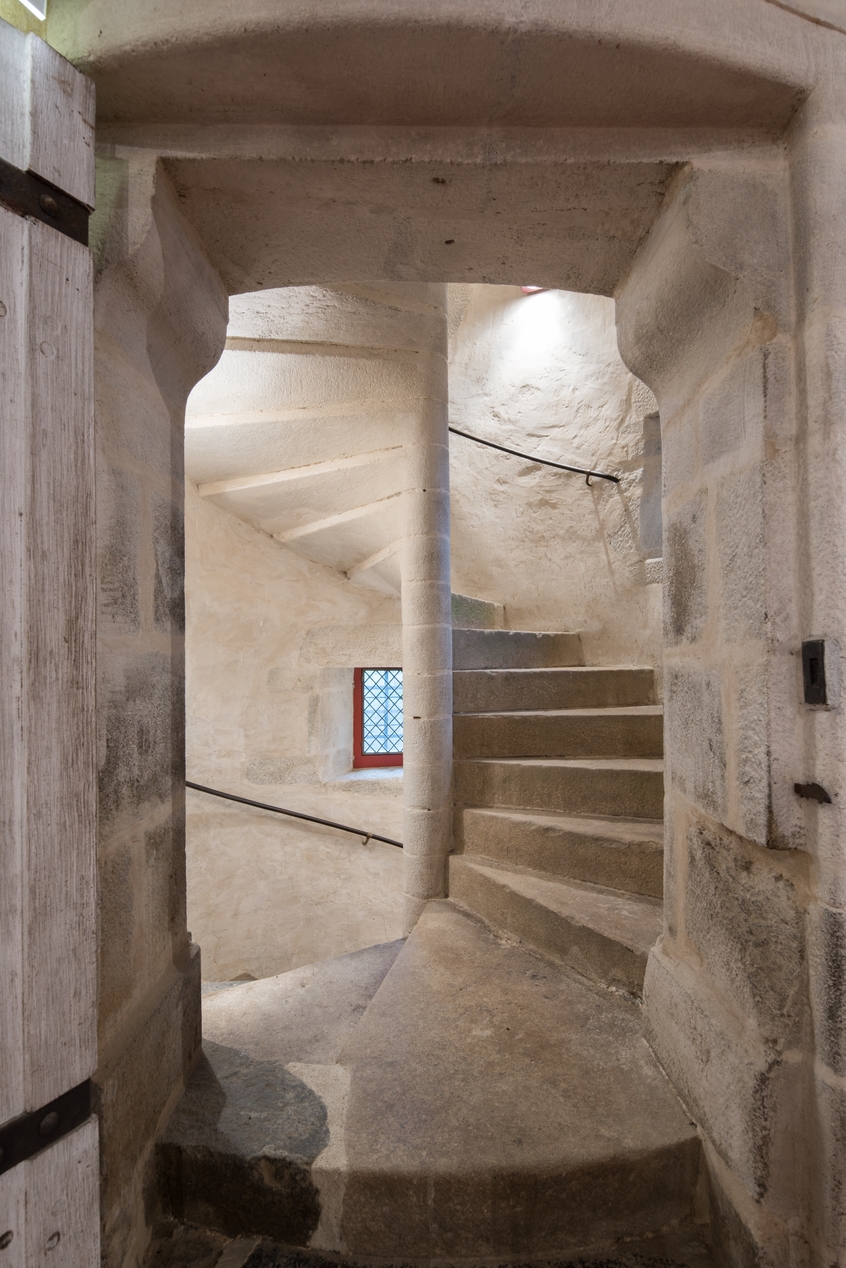 Logis seigneurial, accès à la salle du premier étage (marche palière de l'escalier)Immatriculation