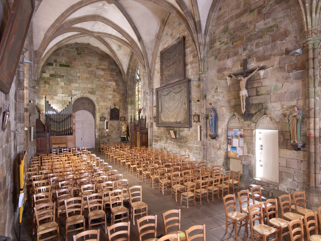 Minihy-Tréguier, rue de l'Église : église Saint-Yves, vue générale de la nef vers l'ouest. A droite, les deux portes du porche nordImmatriculation